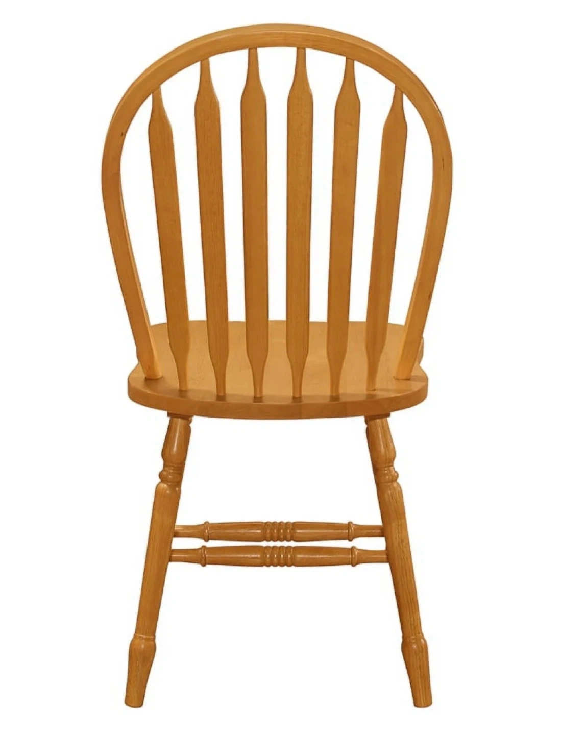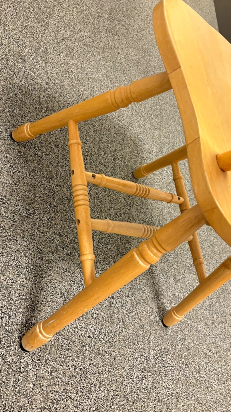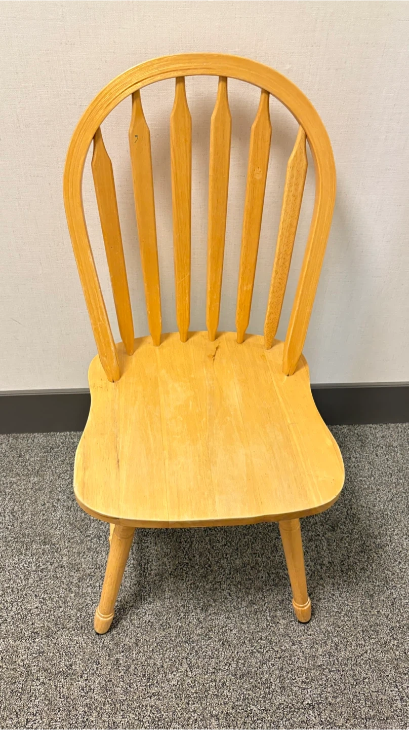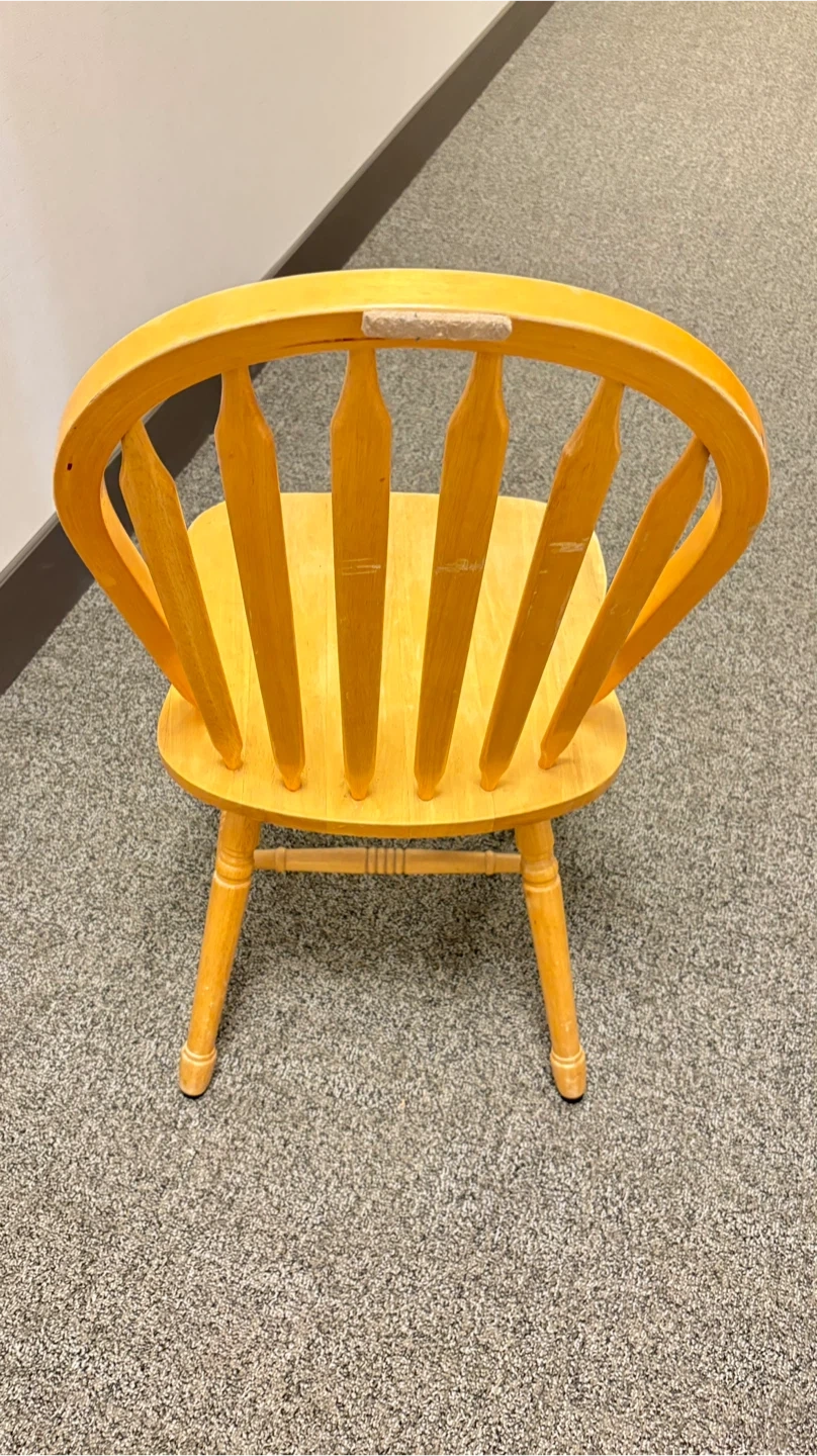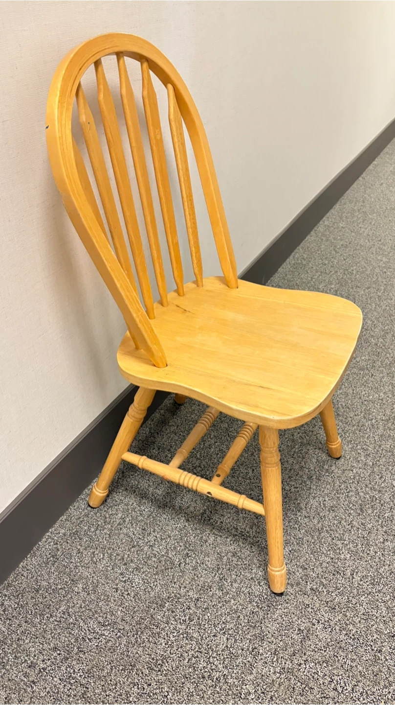 Here's a classic wooden spindle back dining chair! It's in great shape and ready to add some charm to your dining space or kitchen. The light wood tone is versatile and would fit in with many decor styles. It has some signs of use.