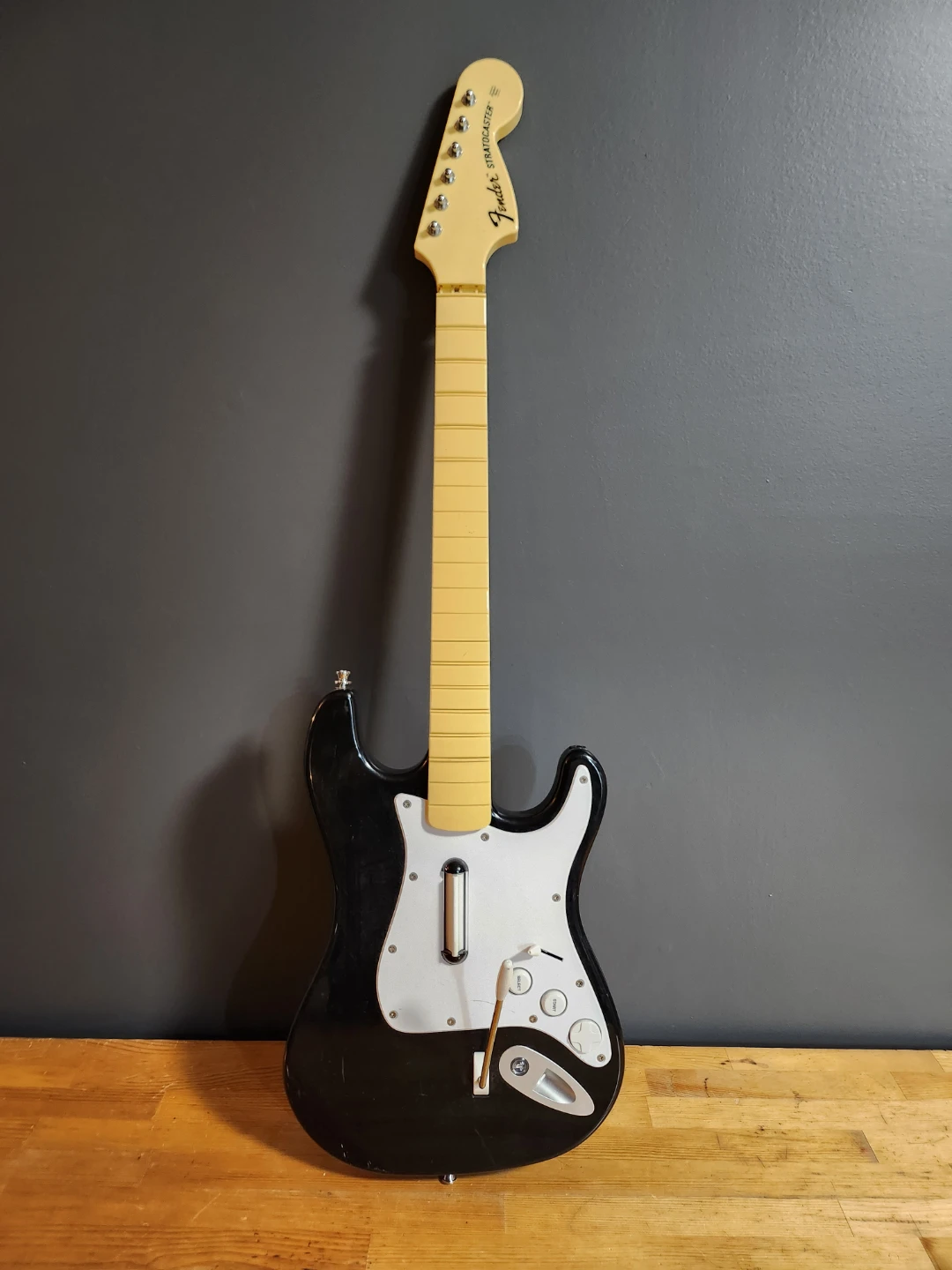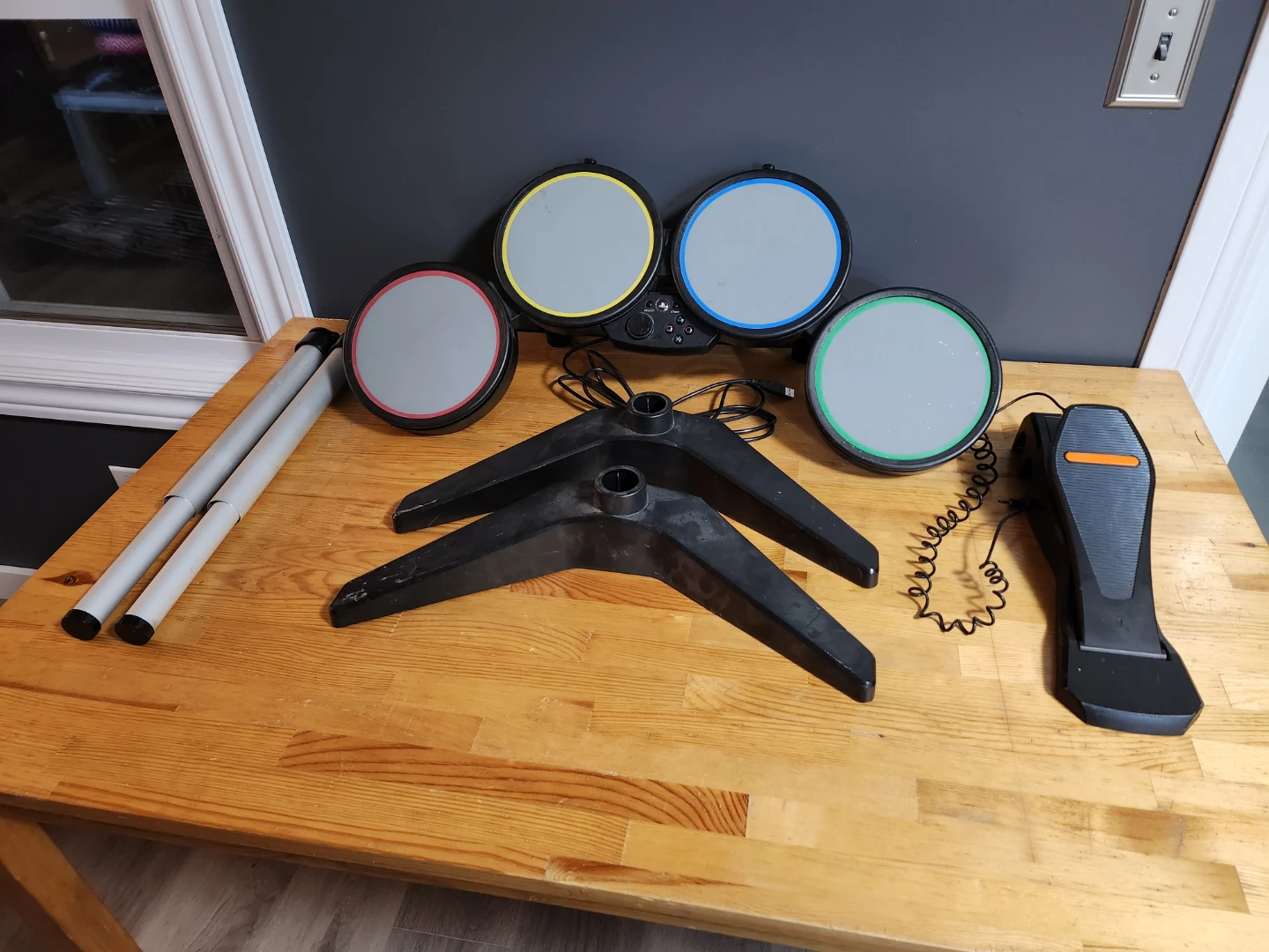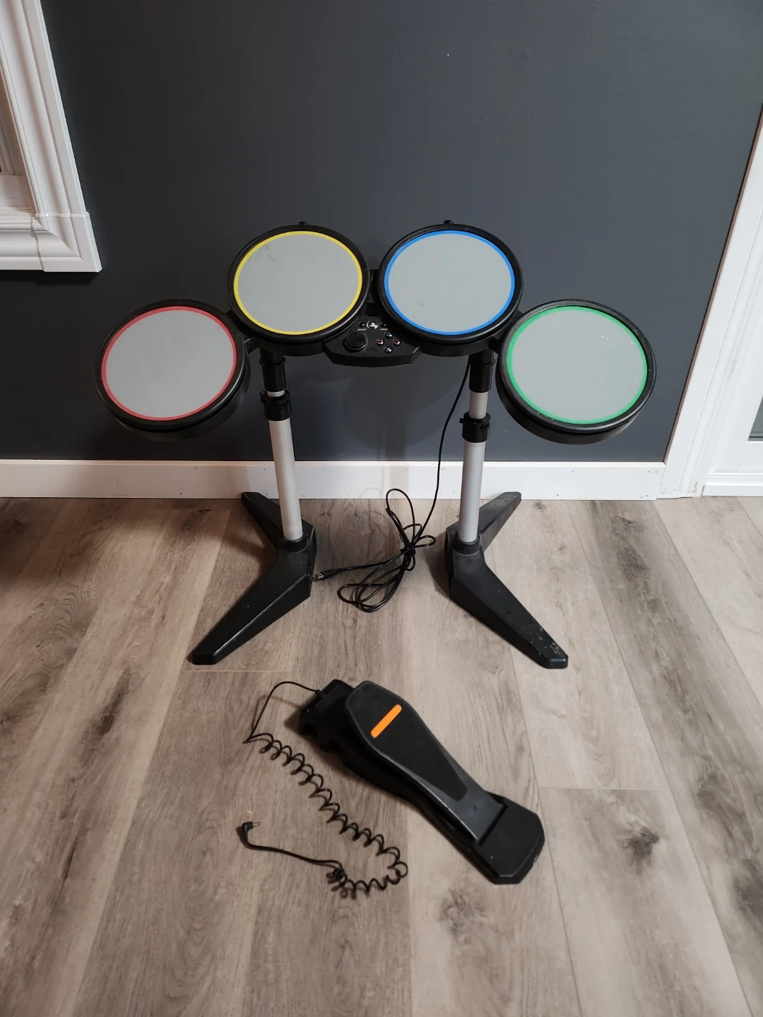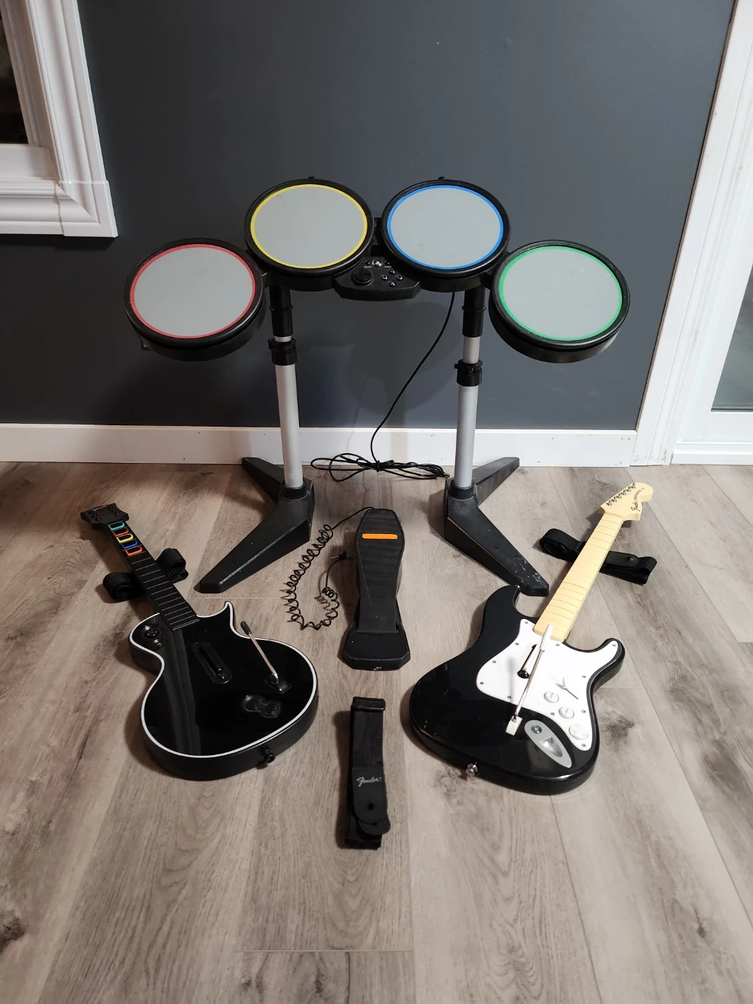 Guitar Hero band set. Drum set, two guitars + straps (×3). (one Gibson, one Fender Stratocaster), and a Fender guitar strap. A great addition to any retro games collection!
