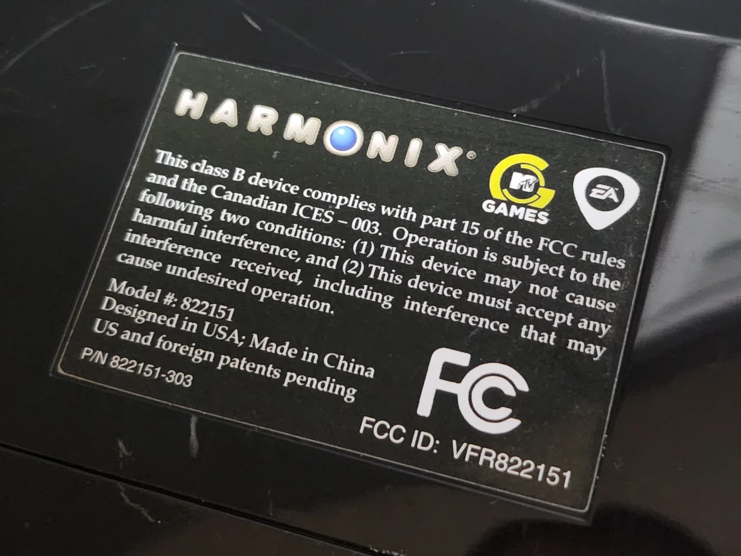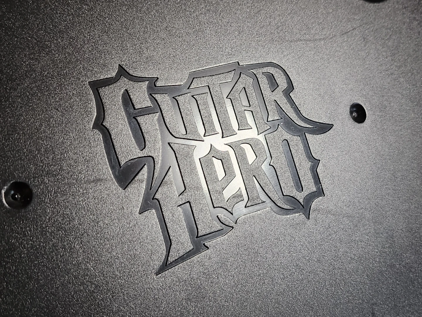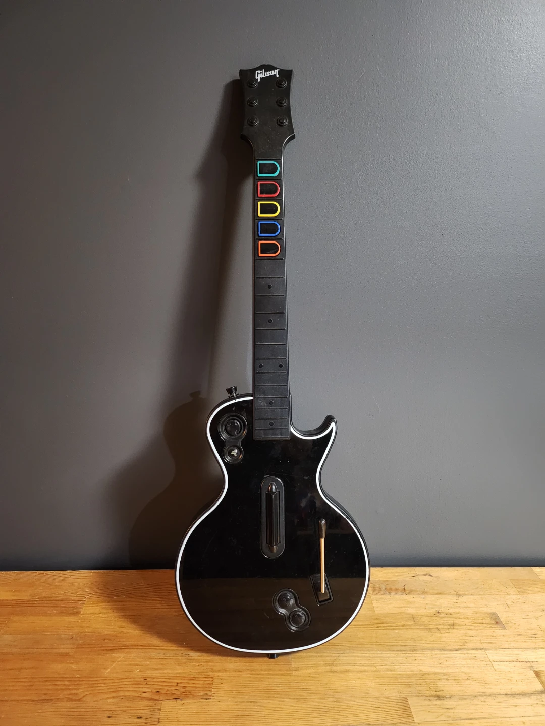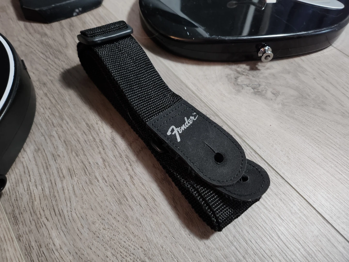 Guitar Hero band set. Drum set, two guitars + straps (×3). (one Gibson, one Fender Stratocaster), and a Fender guitar strap. A great addition to any retro games collection!