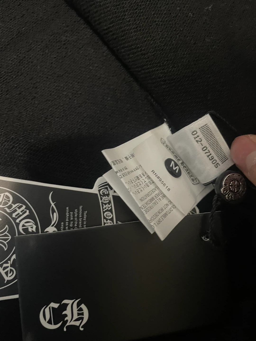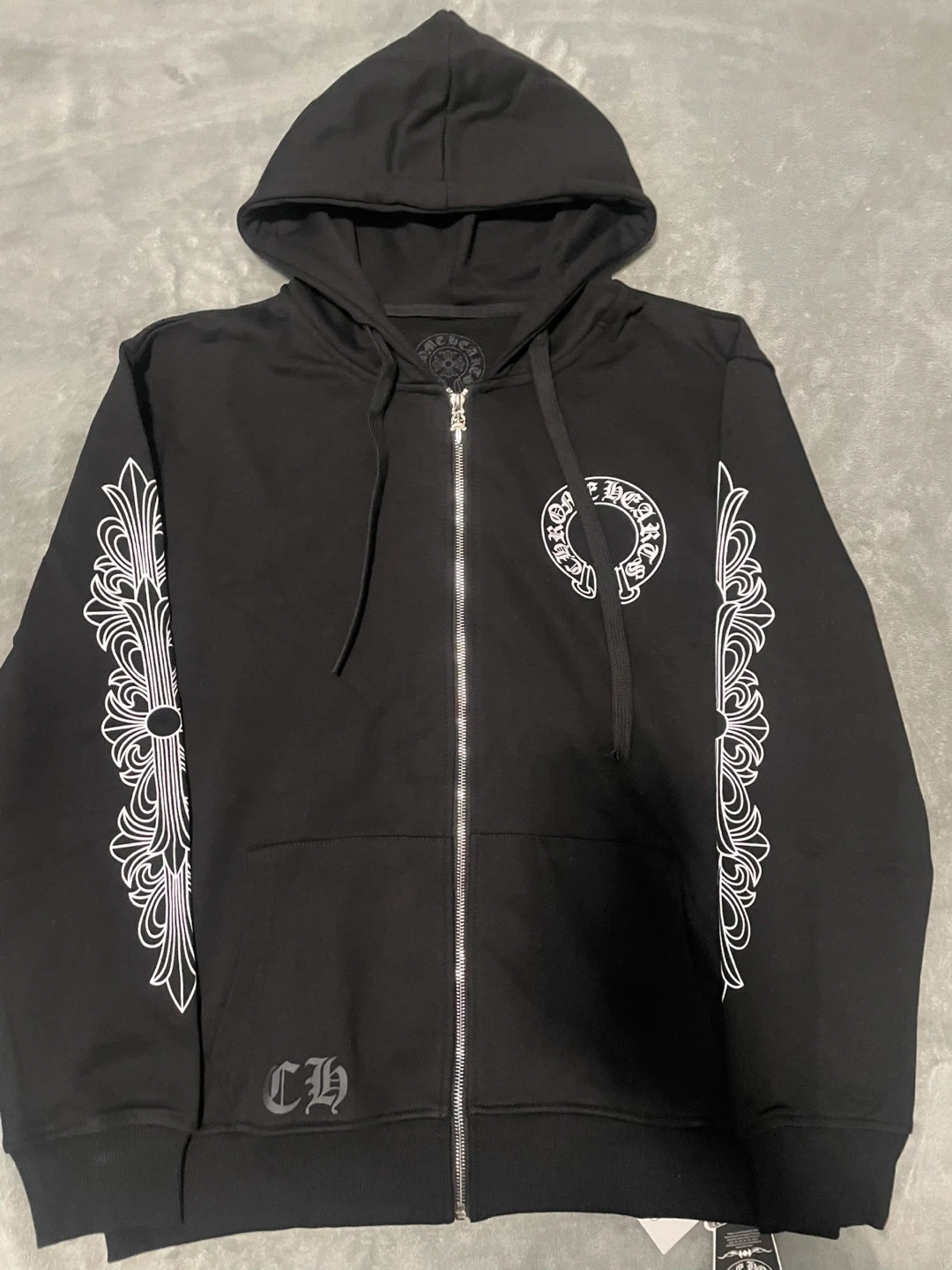 Selling a Chrome Hearts hoodie in black, size medium. It features the classic Chrome Hearts horseshoe logo on the back and cross designs down the sleeves. The zipper pull also has the Chrome Hearts dagger design.