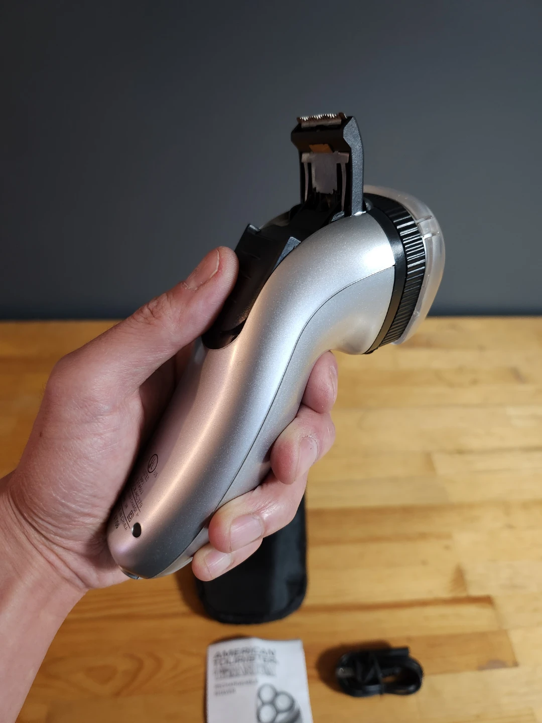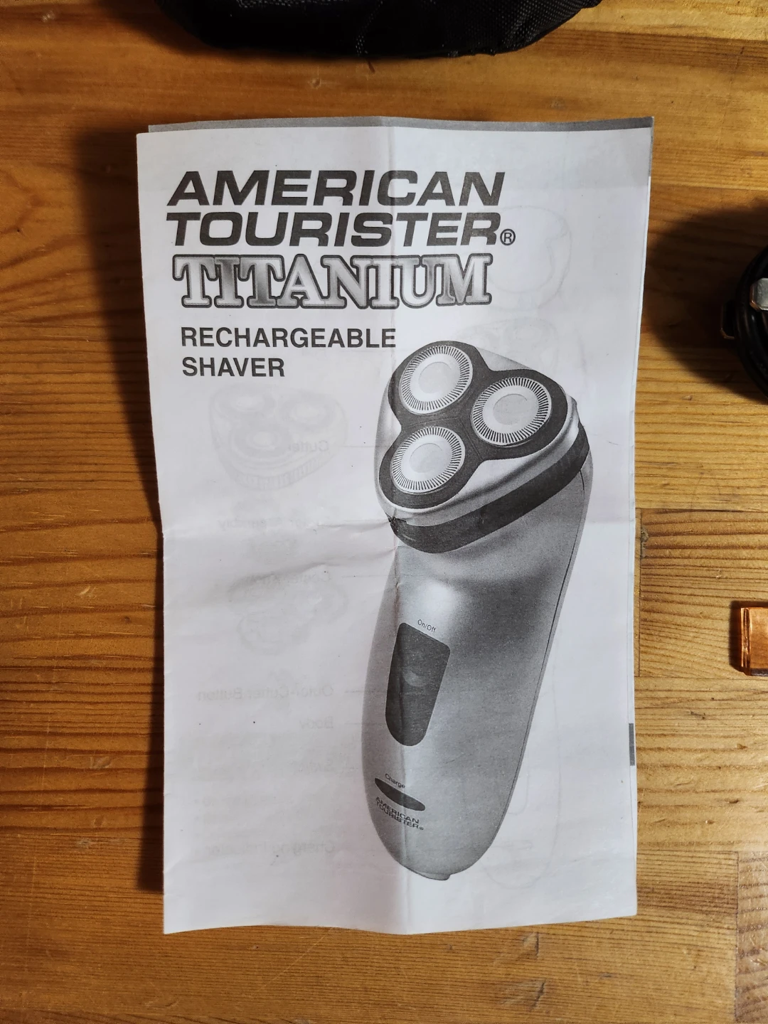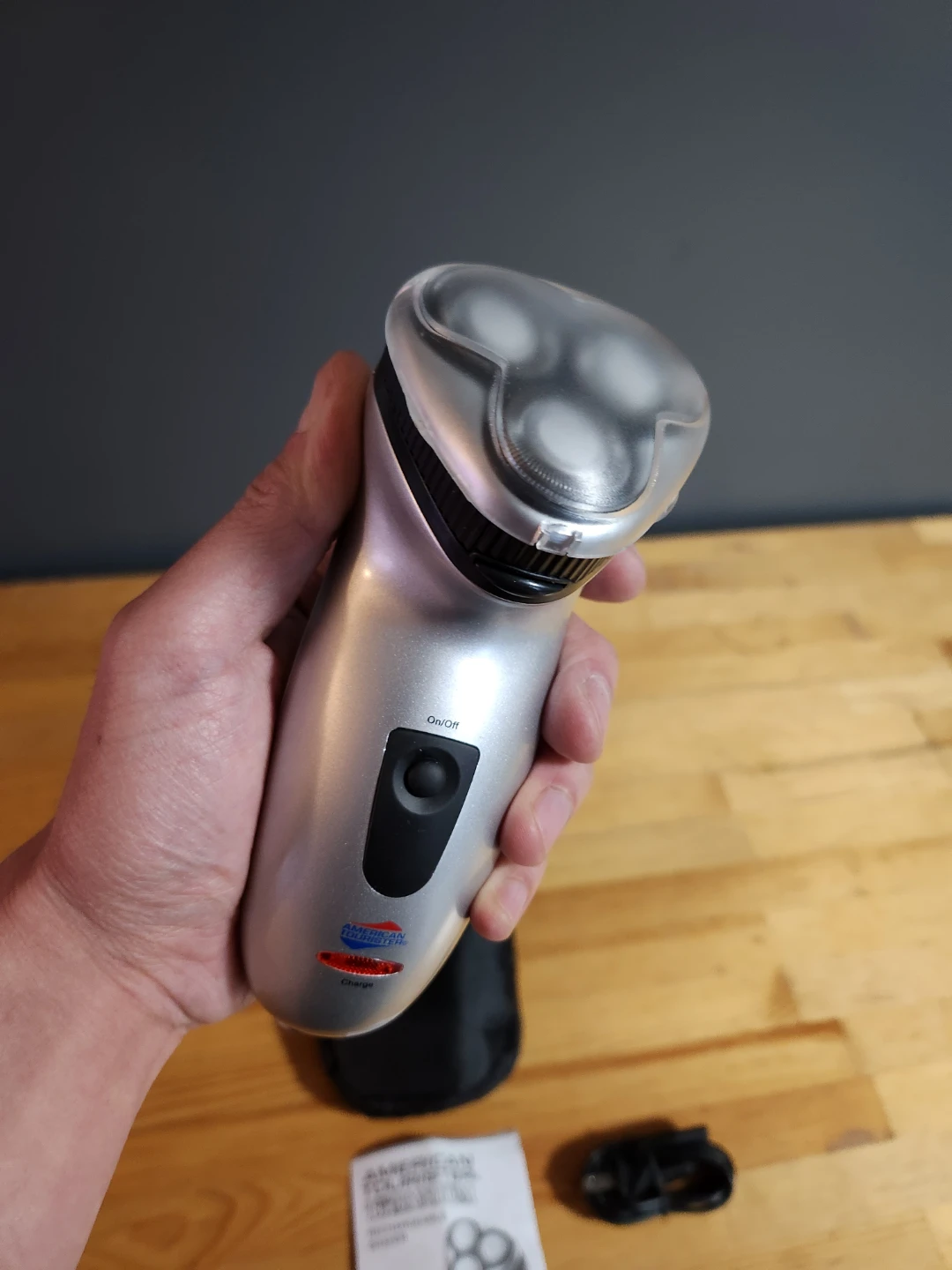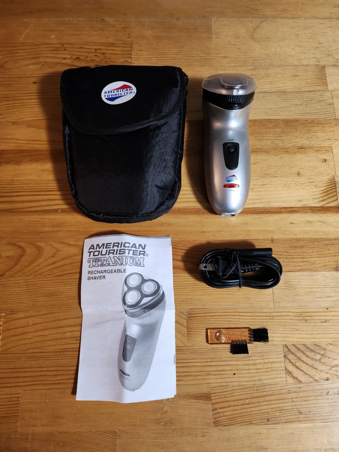 American Tourister Titanium Rechargeable Shaver. This model is the travel-oriented, triple-head rotary shaver.