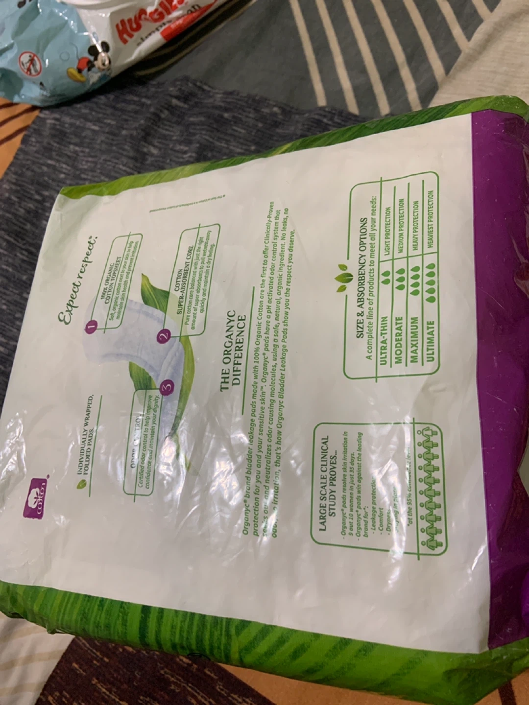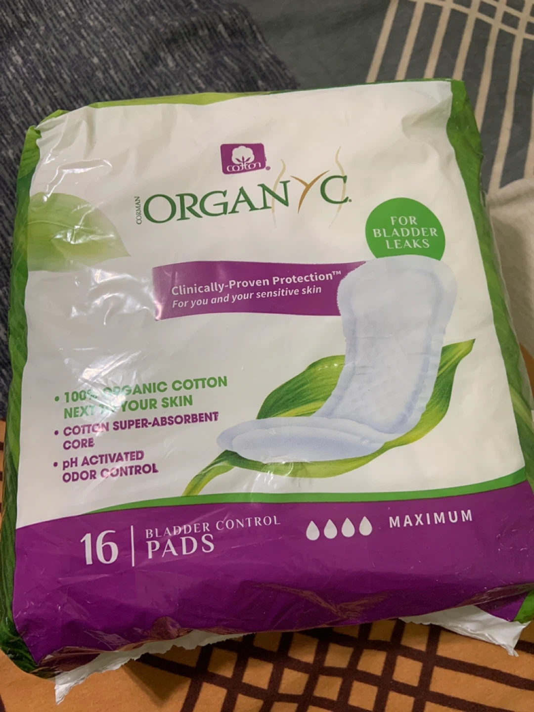 Selling a pack of Organyc bladder control pads. The pack contains 16 pads, offering maximum absorbency and clinically-proven protection for sensitive skin. They feature 100% organic cotton next to your skin, a cotton super-absorbent core, and pH-activated odour control. The expiration date is 2026 June 05