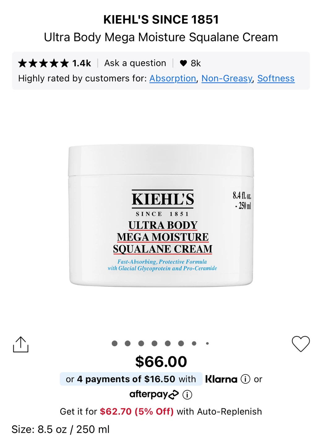 I'm selling Kiehl's Ultra Body Mega Moisture Squalane Cream! It's formulated with squalane, glacial glycoprotein, and pro-ceramides. It helps to deeply hydrate skin and lock in moisture, as well as repair and strengthen the skin barrier! It's suitable for all skin types and eczema-prone skin too
