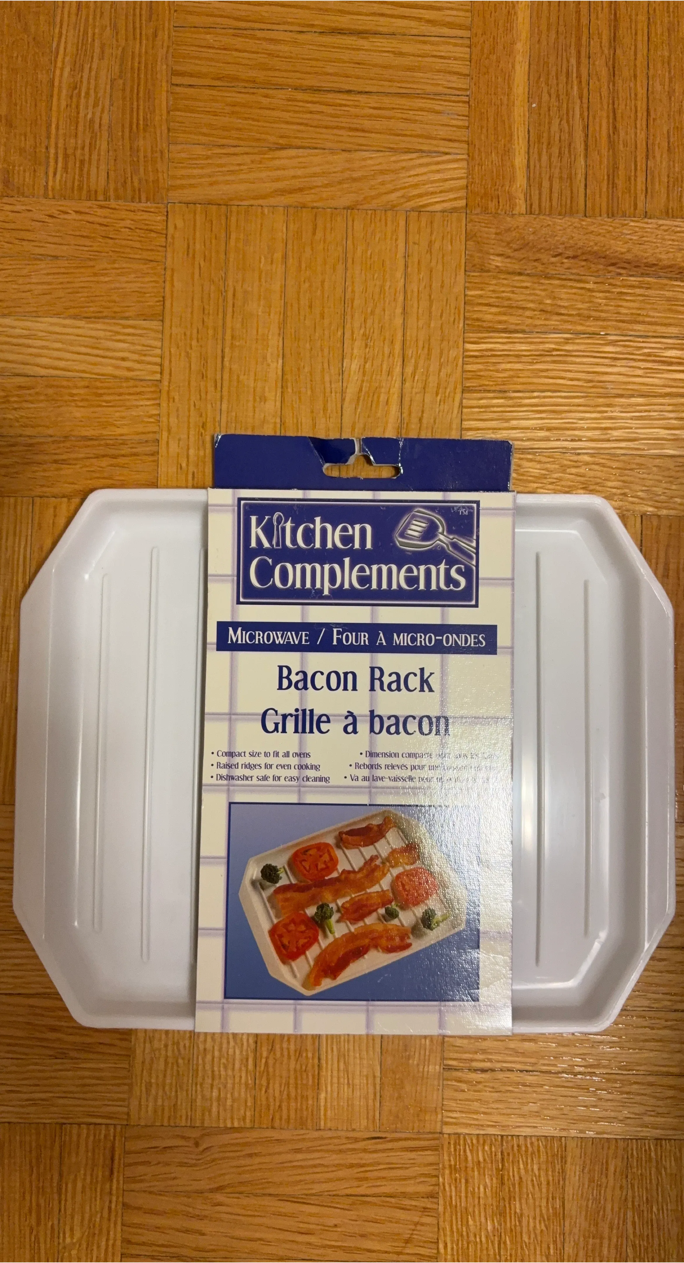 Selling a brand new Kitchen Complements bacon rack, still in its original packaging! It's designed for microwave use and is dishwasher safe for easy cleaning. The compact size fits most ovens, and it features raised ridges for even cooking
