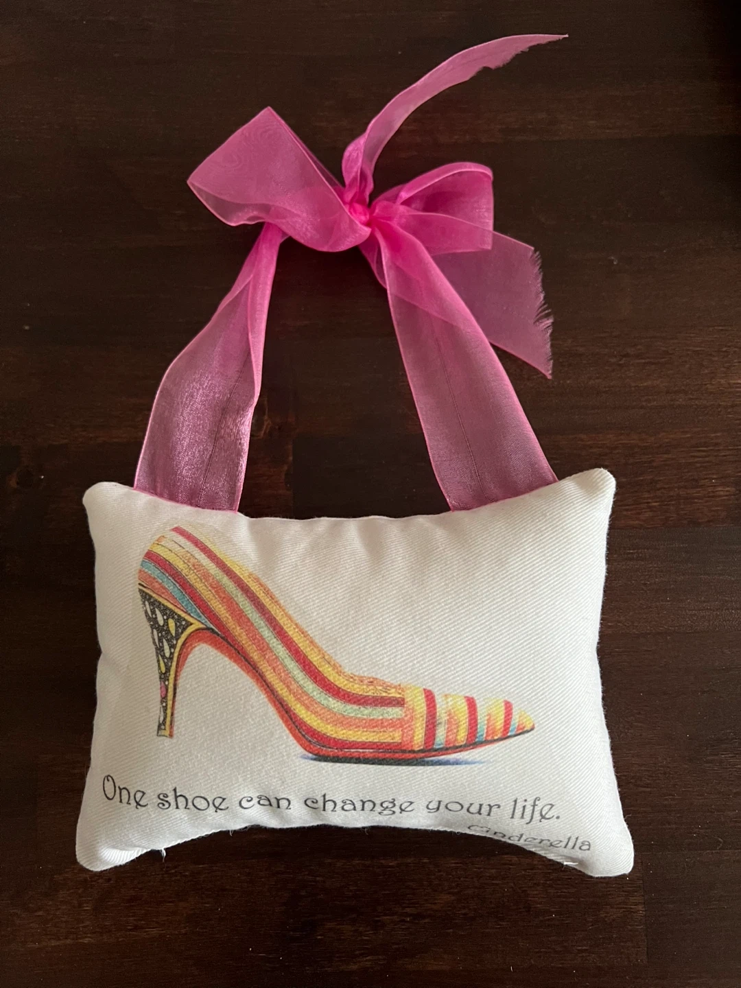 This is a cute Cinderella shoe pillow ornament. It has a pink bow on the top. The pillow has the quote 'One shoe can change your life’.