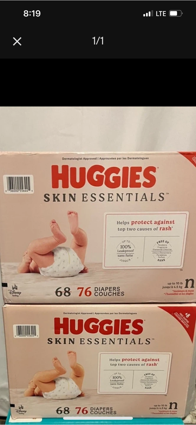 I'm selling 2 boxes of Huggies Skin Essentials diapers! These are size N, which fits babies up to 10 lbs (4.5 kg). The box contains 76 diapers and helps protect against the top two causes of rash. They are also free of parabens, fragrance, and parfum. Great for keeping your little one comfy and dry!