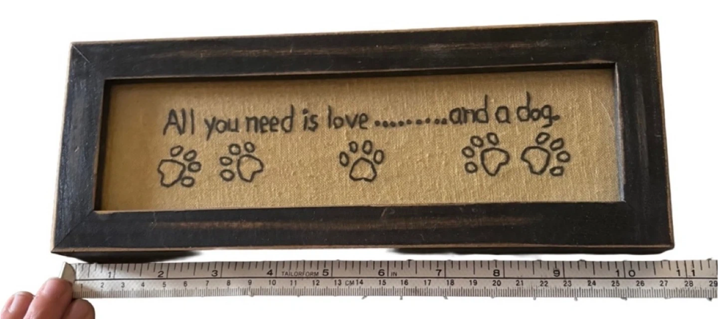 Rustic Wooden Dog Plaque: A charming piece of home decor featuring the sweet sentiment: "All you need is love... and a dog." Finished with cute paw print accents and a distressed black frame, it’s perfect for a mantel, shelf, or entryway.