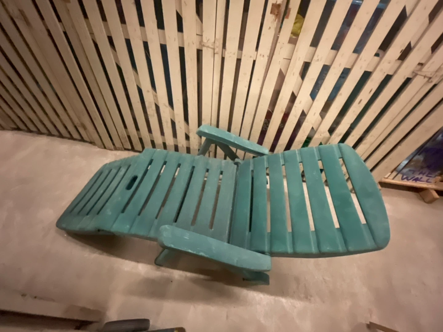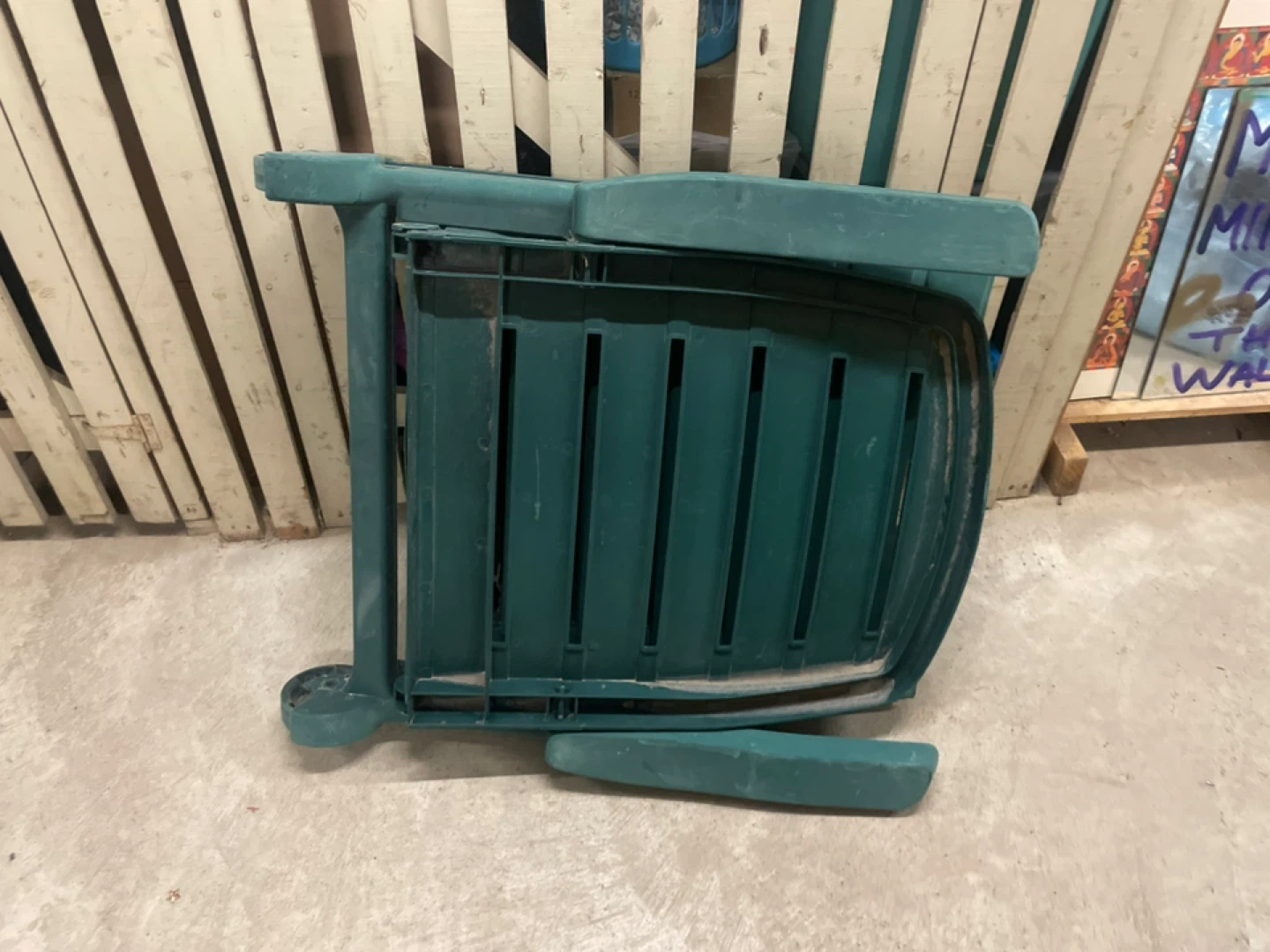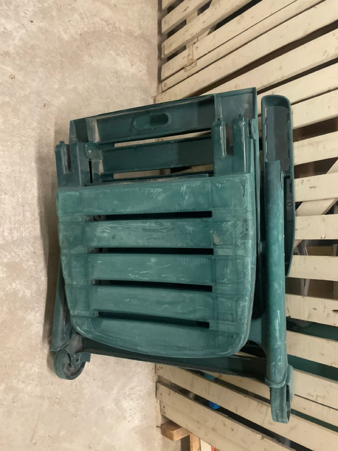Selling a green folding plastic lawn chair. It's perfect for relaxing in the backyard or taking to the park. It's lightweight and easy to carry, making it a great addition to your outdoor activities