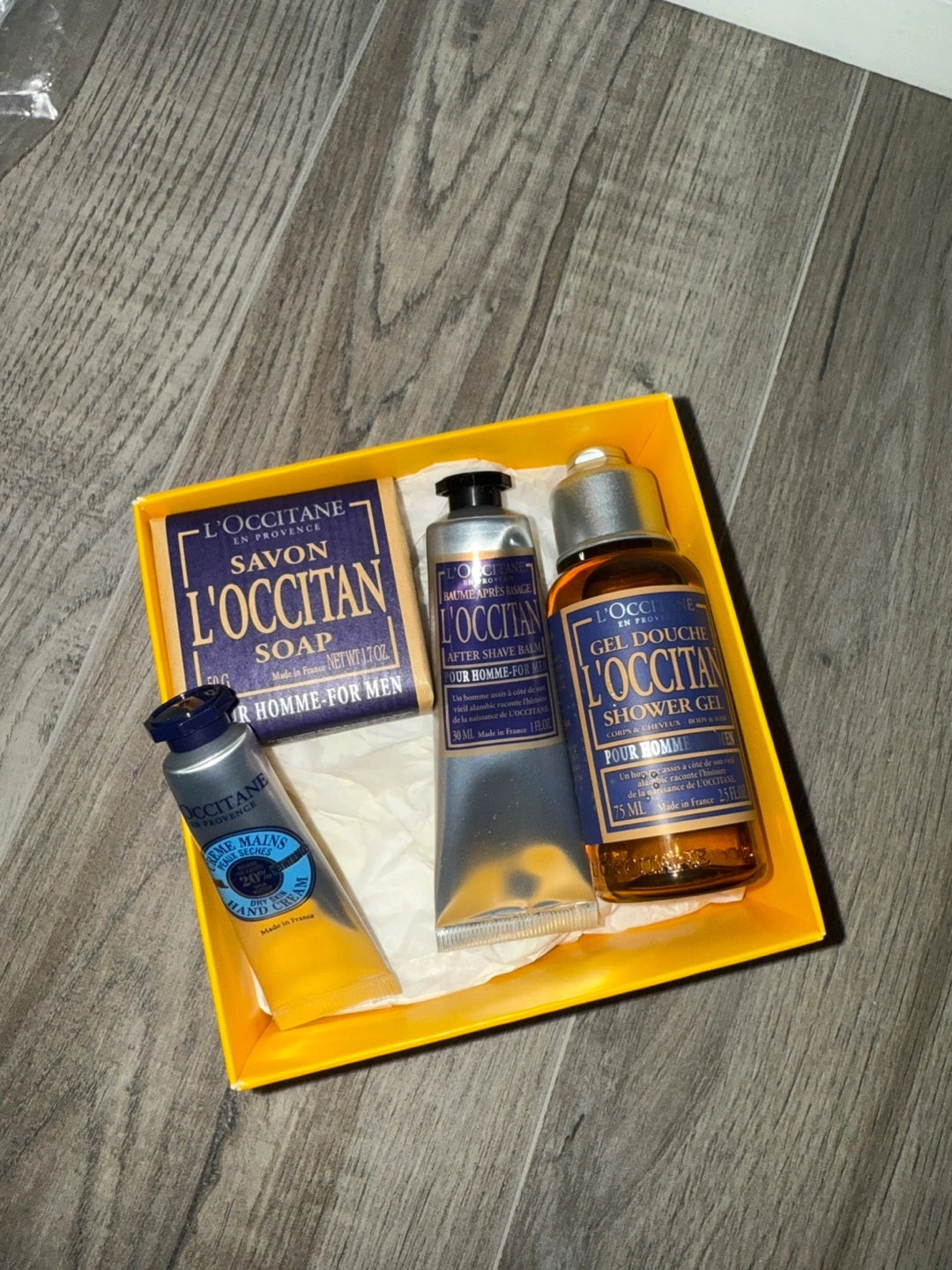 Selling a L'Occitane men's collection gift set. It includes soap, after shave balm, shower gel, and hand cream. Great for gifting or treating yourself! The box is included. Never been used!