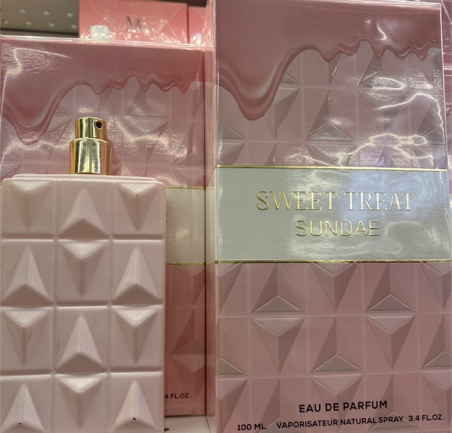 Selling a bottle of Sweet Treat Sundae Eau de Parfum! It's a 100ml bottle with a lovely, sweet scent. The bottle itself has a unique, geometric design. Vaporisateur natural spray 3.4 fl.oz.