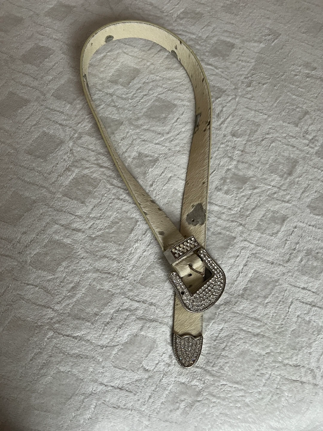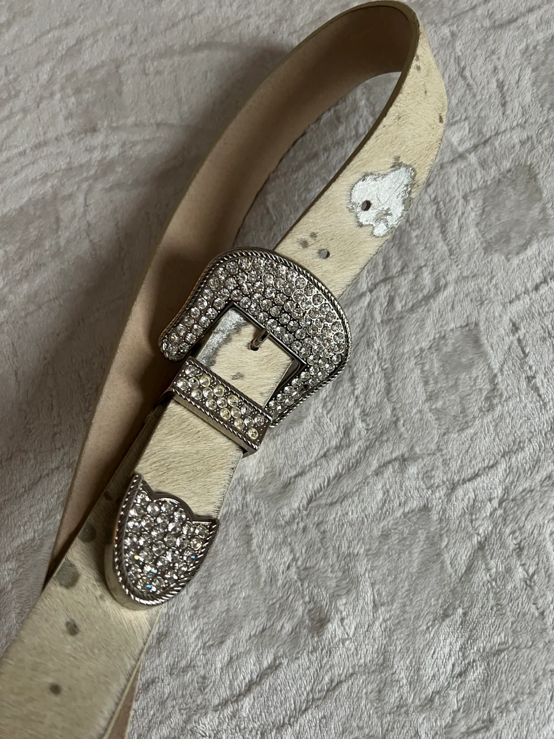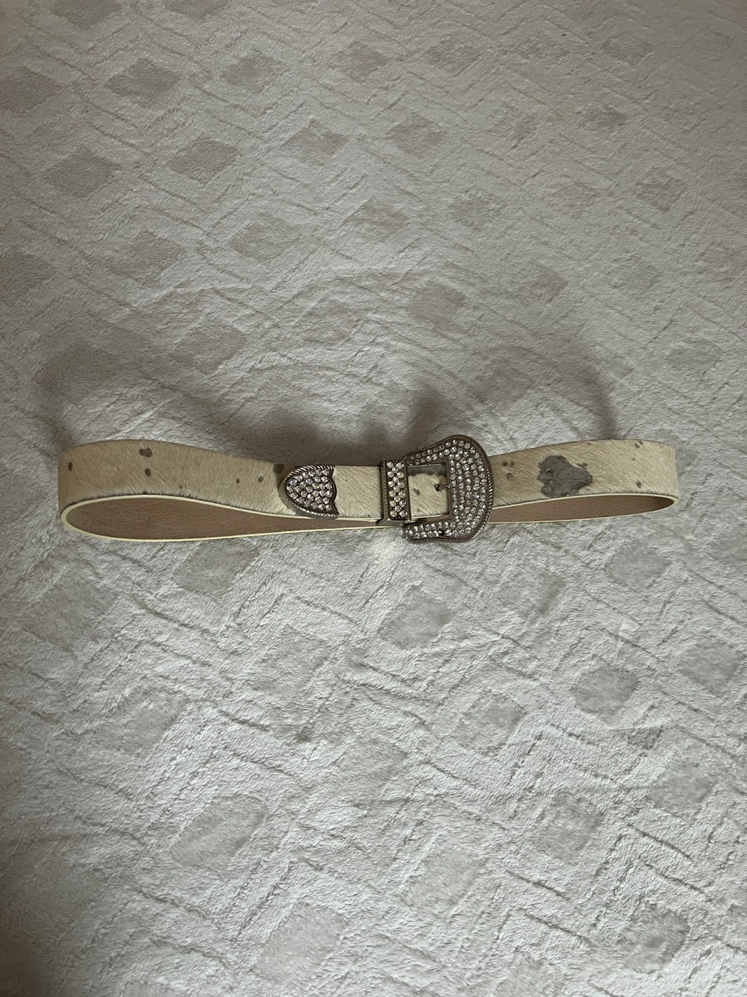 Selling a cream and silver cow print belt with a rhinestone buckle! It's in good condition and would look great with any outfit. Please see photos and note 1 rhinestone is missing.