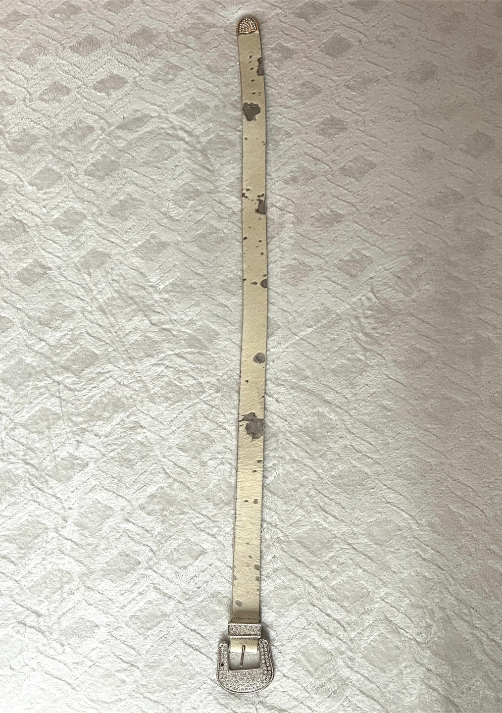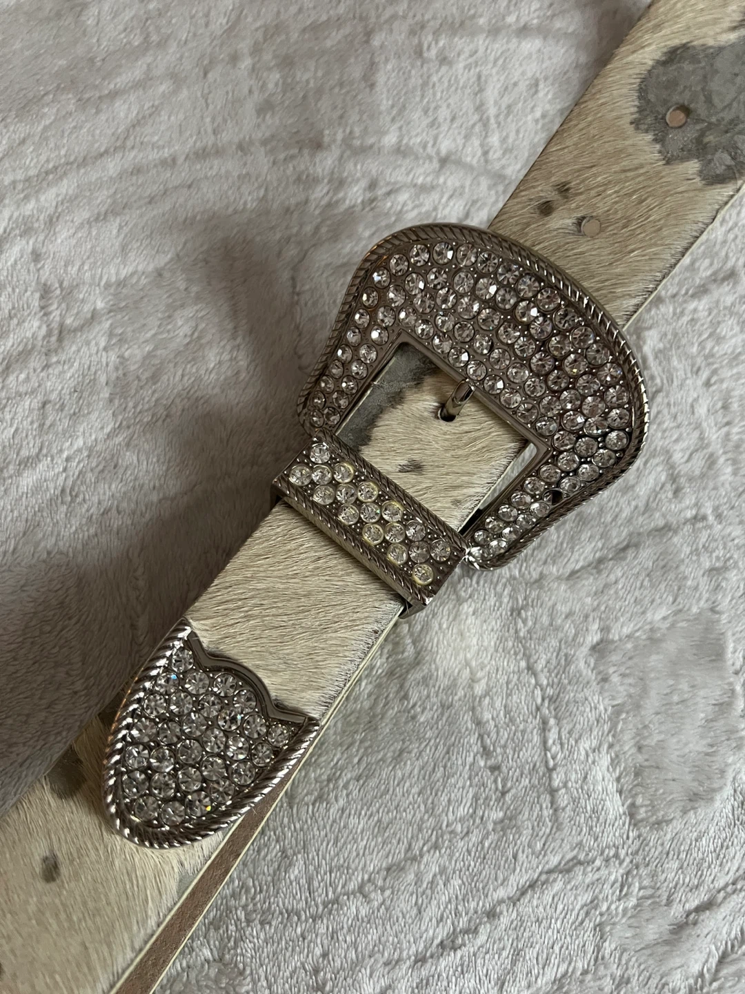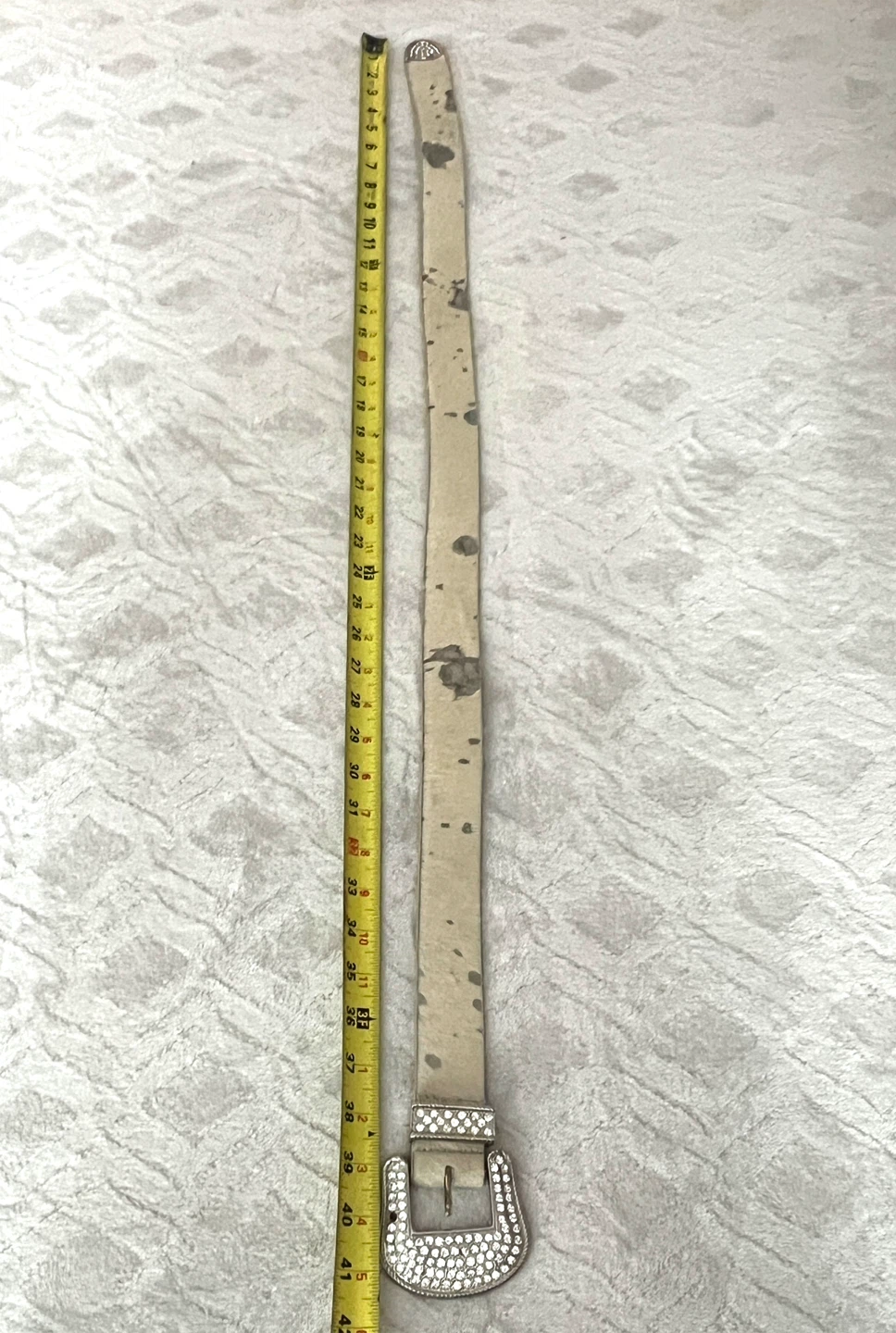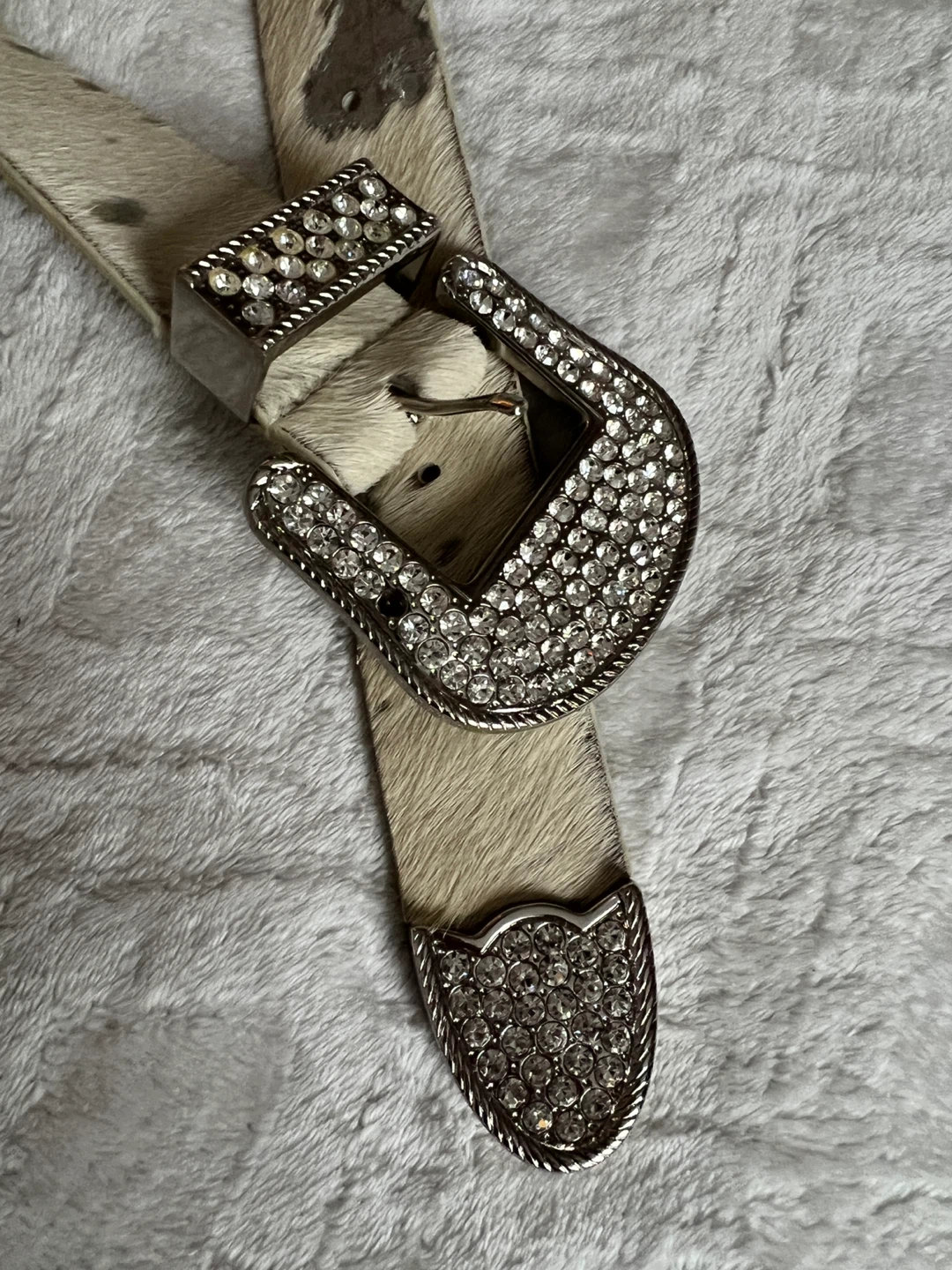 Selling a cream and silver cow print belt with a rhinestone buckle! It's in good condition and would look great with any outfit. Please see photos and note 1 rhinestone is missing.