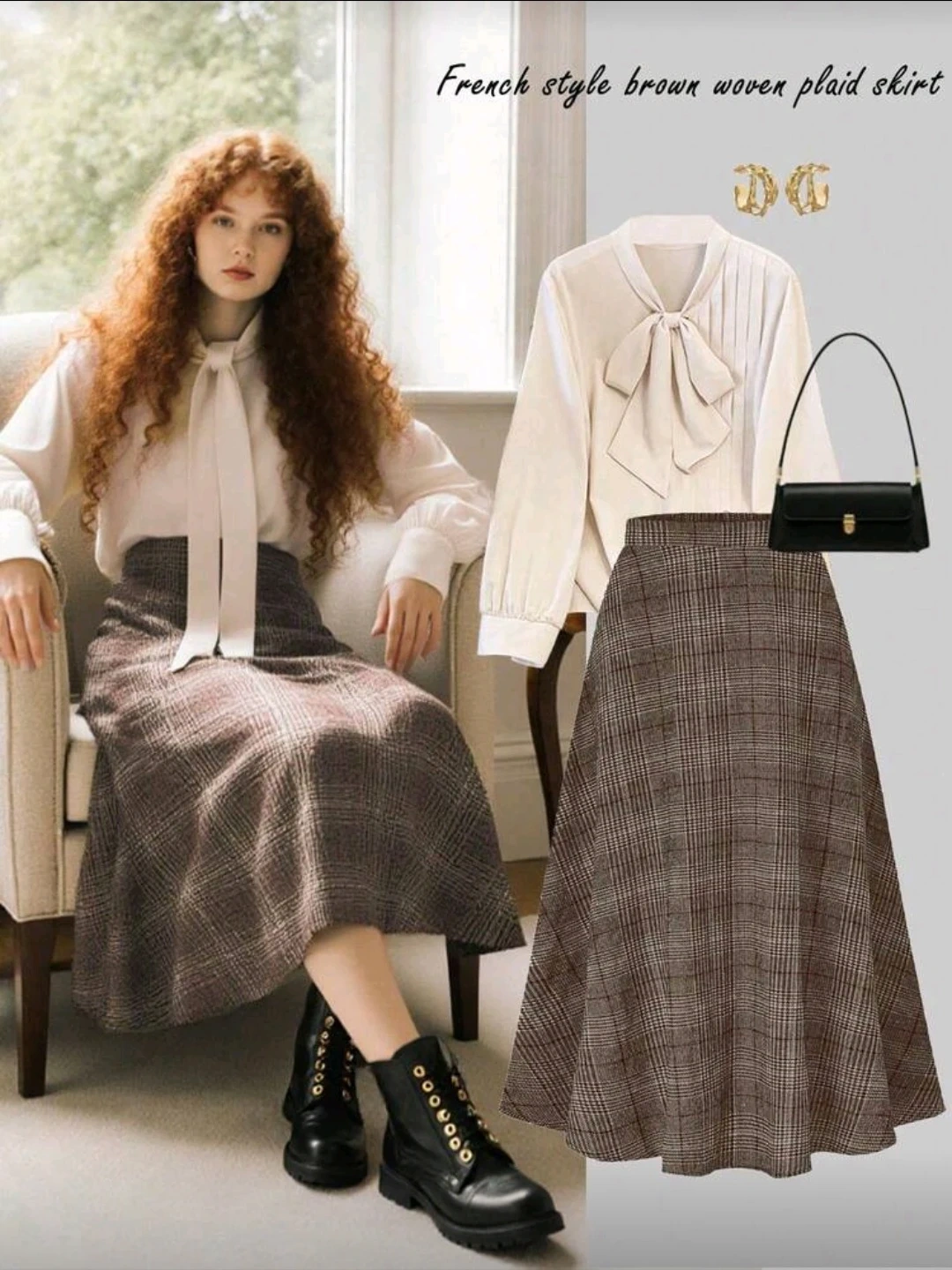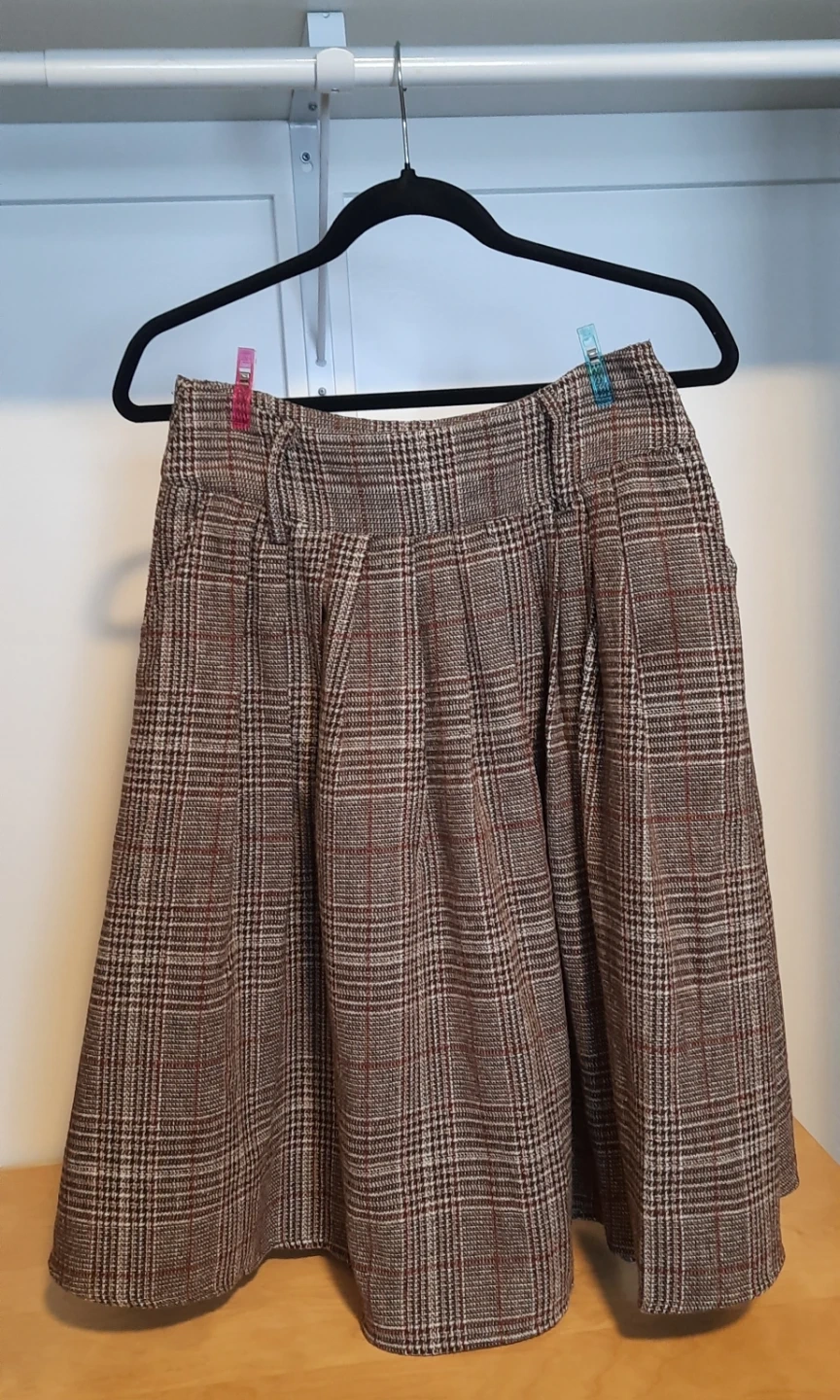 Selling a cute plaid skirt with a brown woven texture! It has a French style vibe and would look great with a blouse and boots. It's in great condition and ready for a new wardrobe