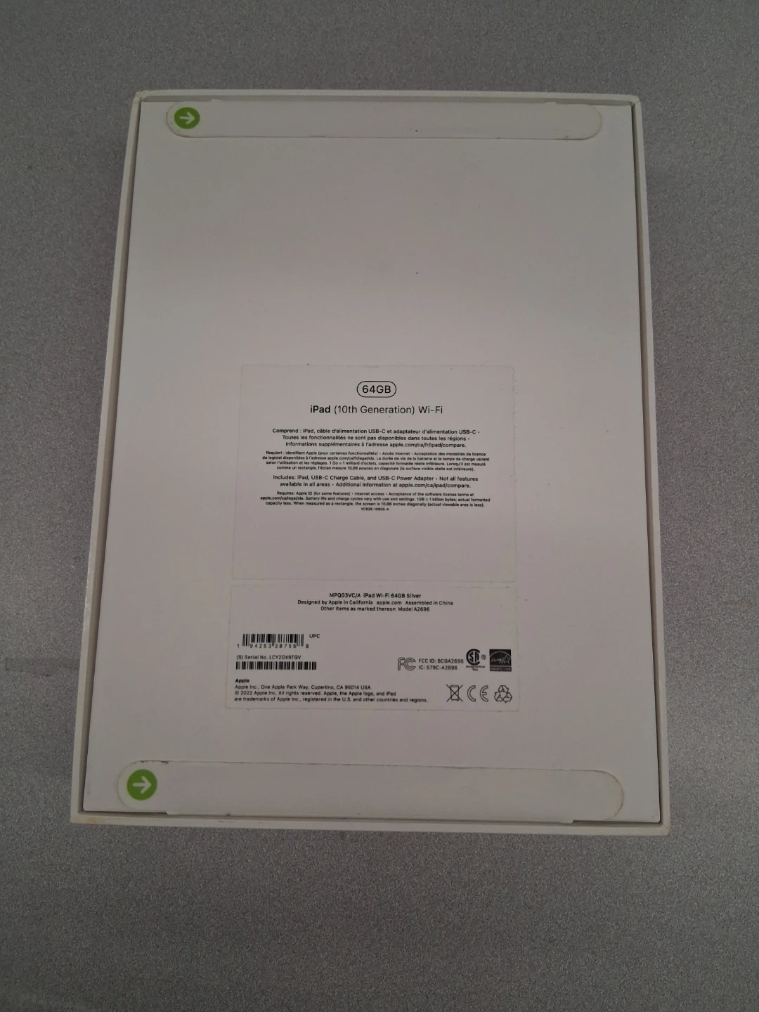 Selling a brand new Apple iPad 10th Generation with 64GB of storage and Wi-Fi in Silver! It's still in its original box and has never been opened. This iPad includes a USB-C charge cable and USB-C power adapter. The model number is MP003VC/A and the other items are marked thereon A2696.