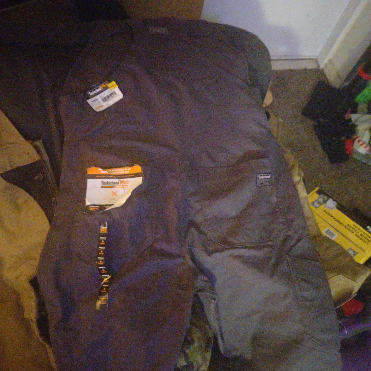 Selling a pair of Timberland PRO men's bib overalls in size a large medium. They are new and ready for work! The overalls are a tan/brown colour.