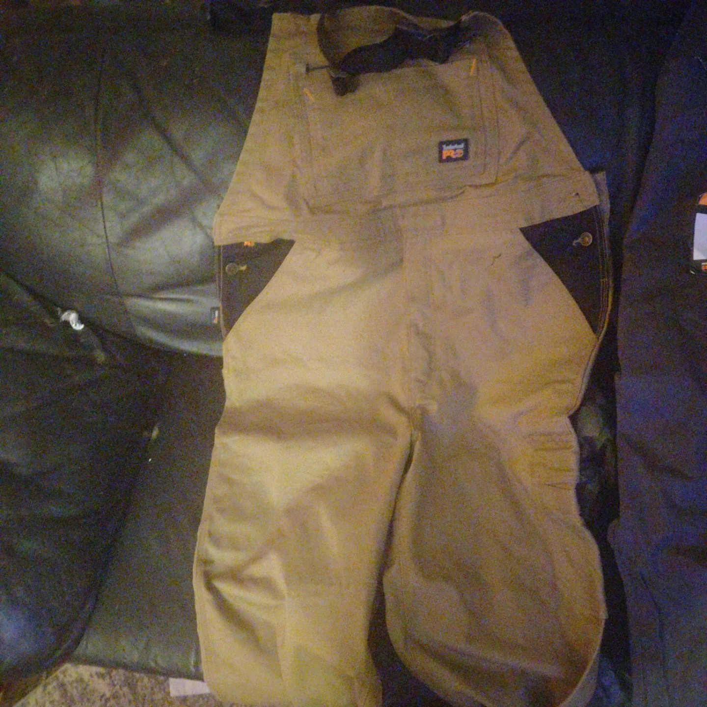 Selling a pair of Timberland PRO men's bib overalls in size a large medium. They are new and ready for work! The overalls are a tan/brown colour.