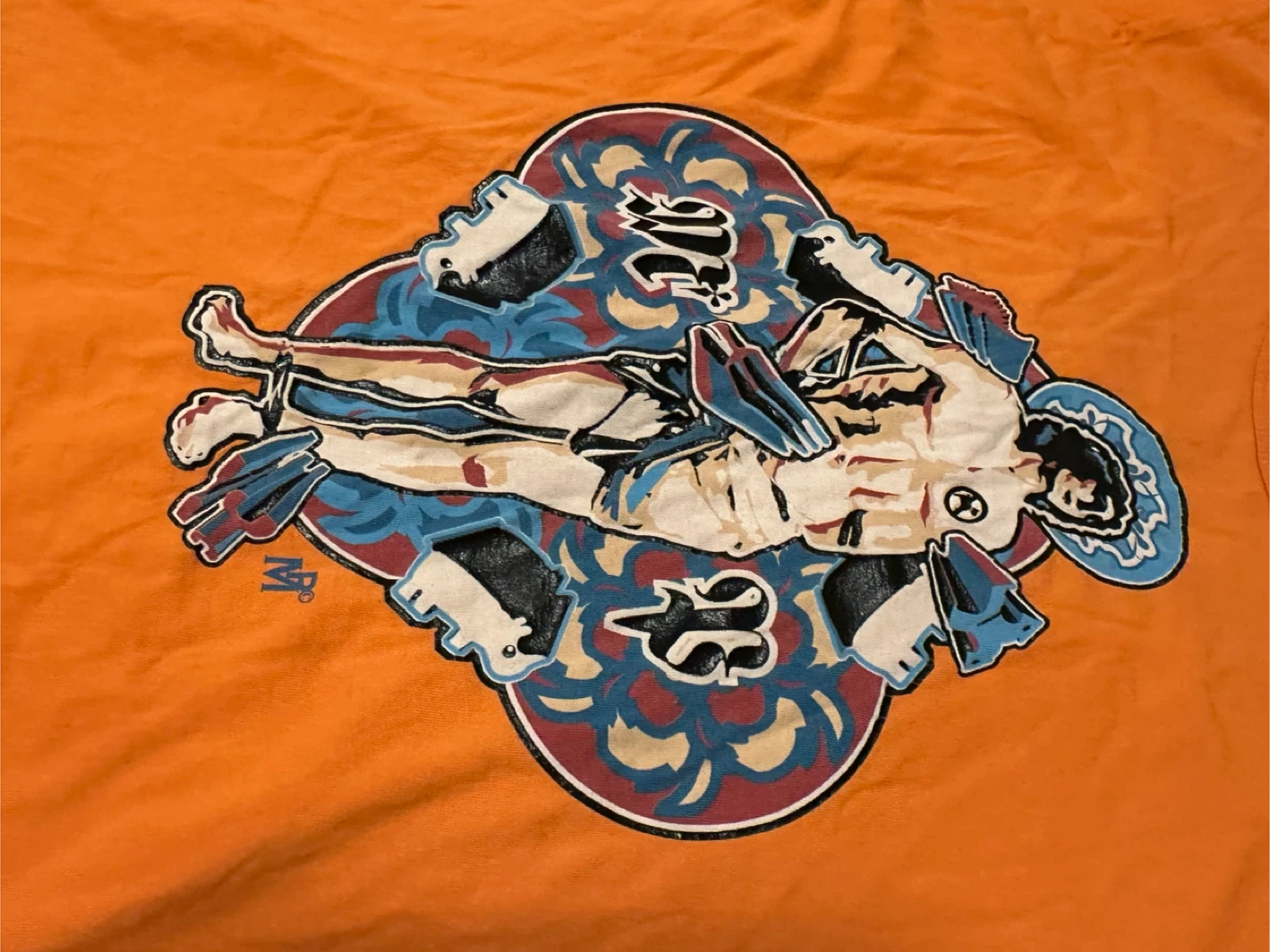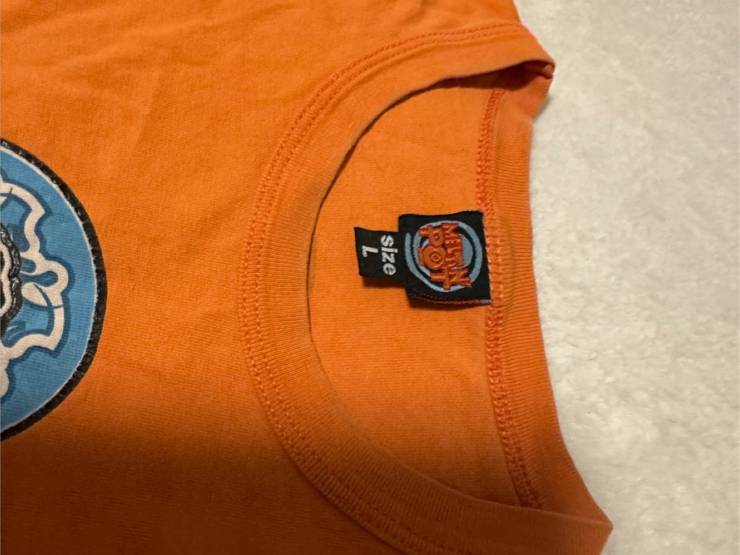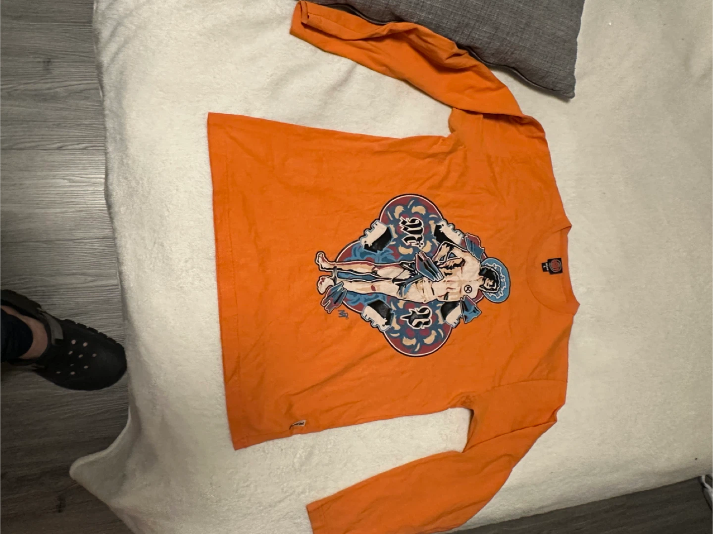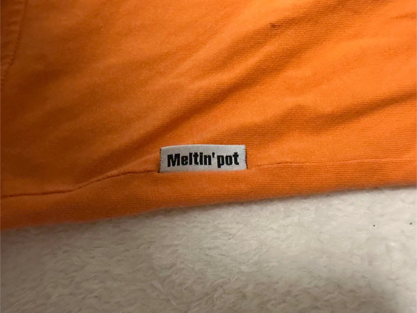 Selling a gently used Meltin'pot long sleeve shirt in size L. It's orange with a unique graphic design on the front. Perfect for adding a pop of colour to your wardrobe!