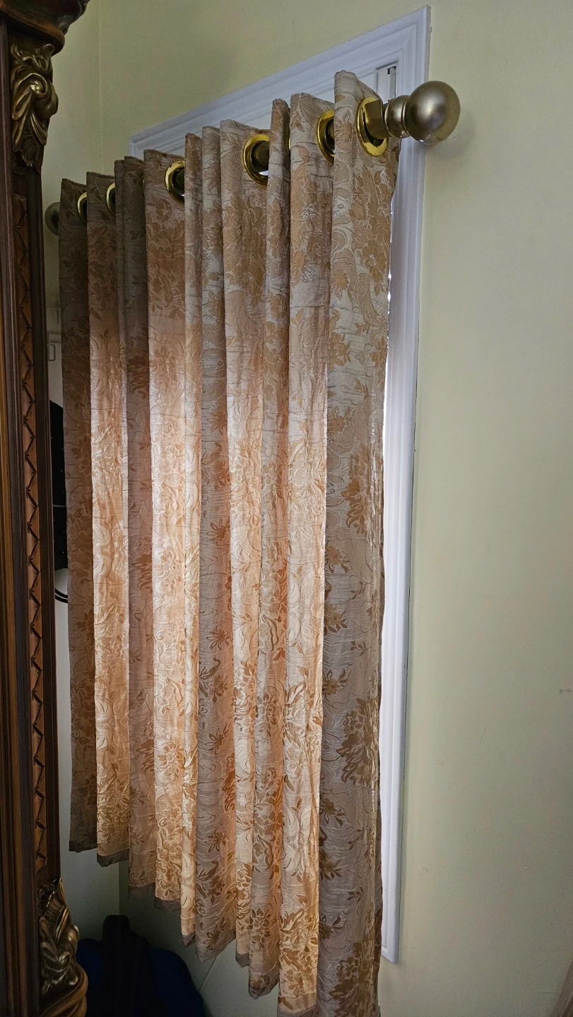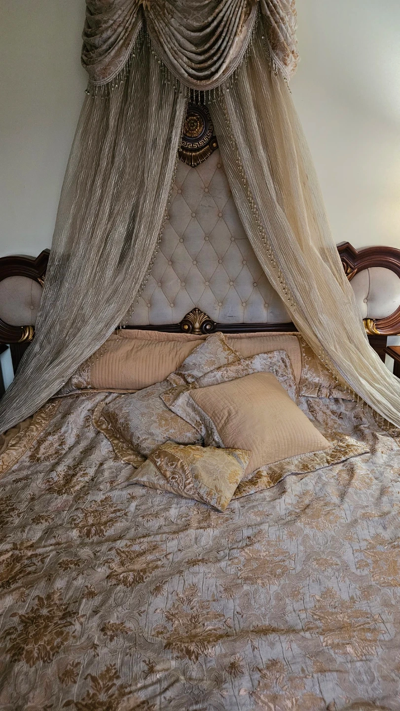 Selling a beautiful bedding set that includes matching curtains! The set features a luxurious design with intricate patterns and a warm, inviting colour palette. It would add a touch of elegance to any bedroom. The curtains complement the bedding perfectly, creating a cohesive and stylish look
