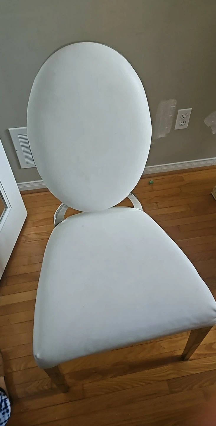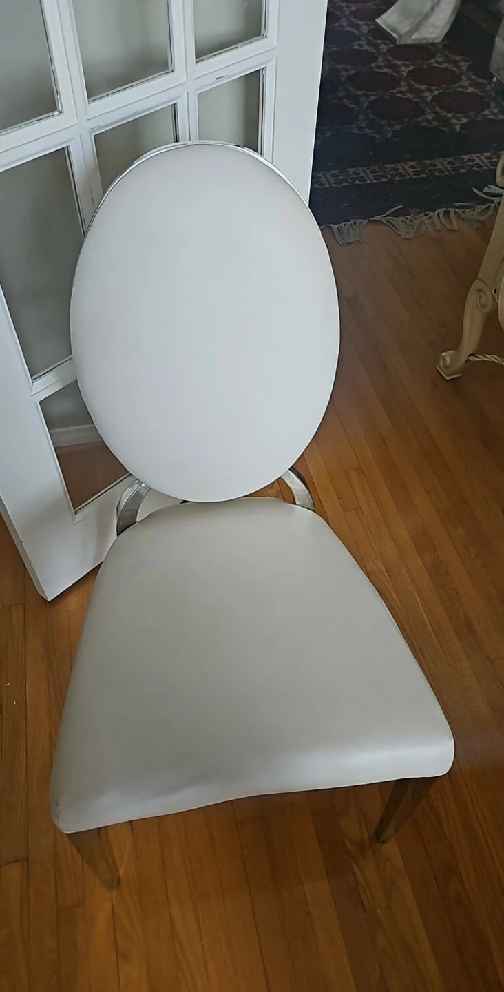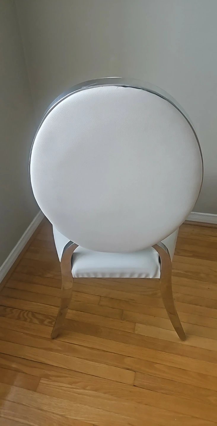 Selling a dining chair with a round back. It's white and has a silver frame. It's in good condition and would look great in any dining room
