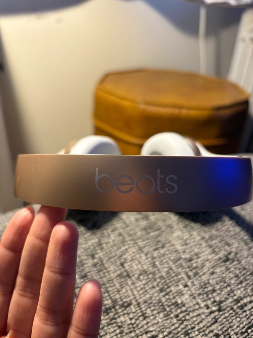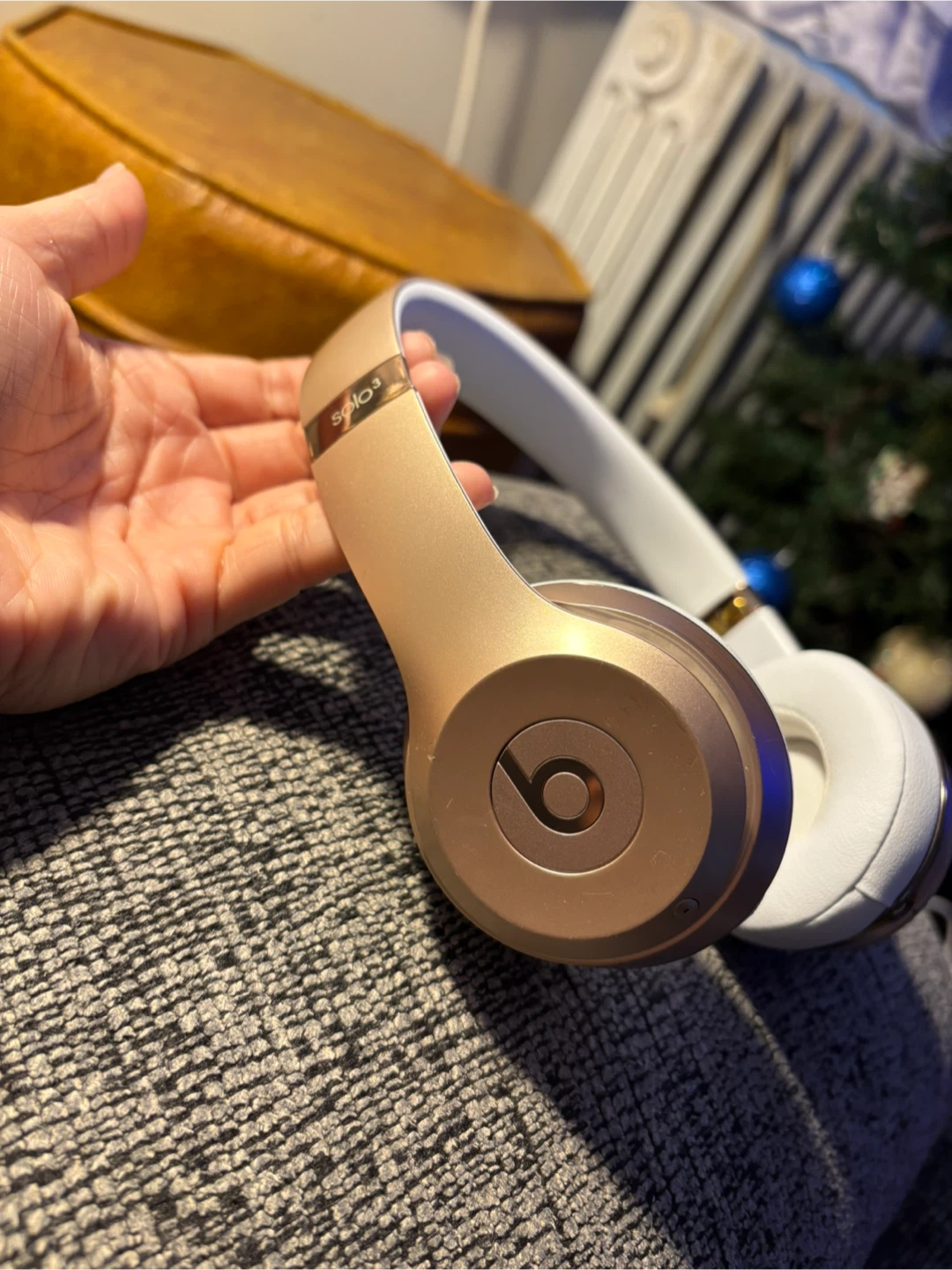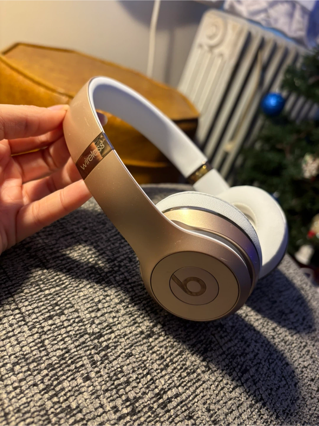 Selling a pair of Beats Solo 3 wireless headphones in gold and white. They're in great shape and ready for a new owner!