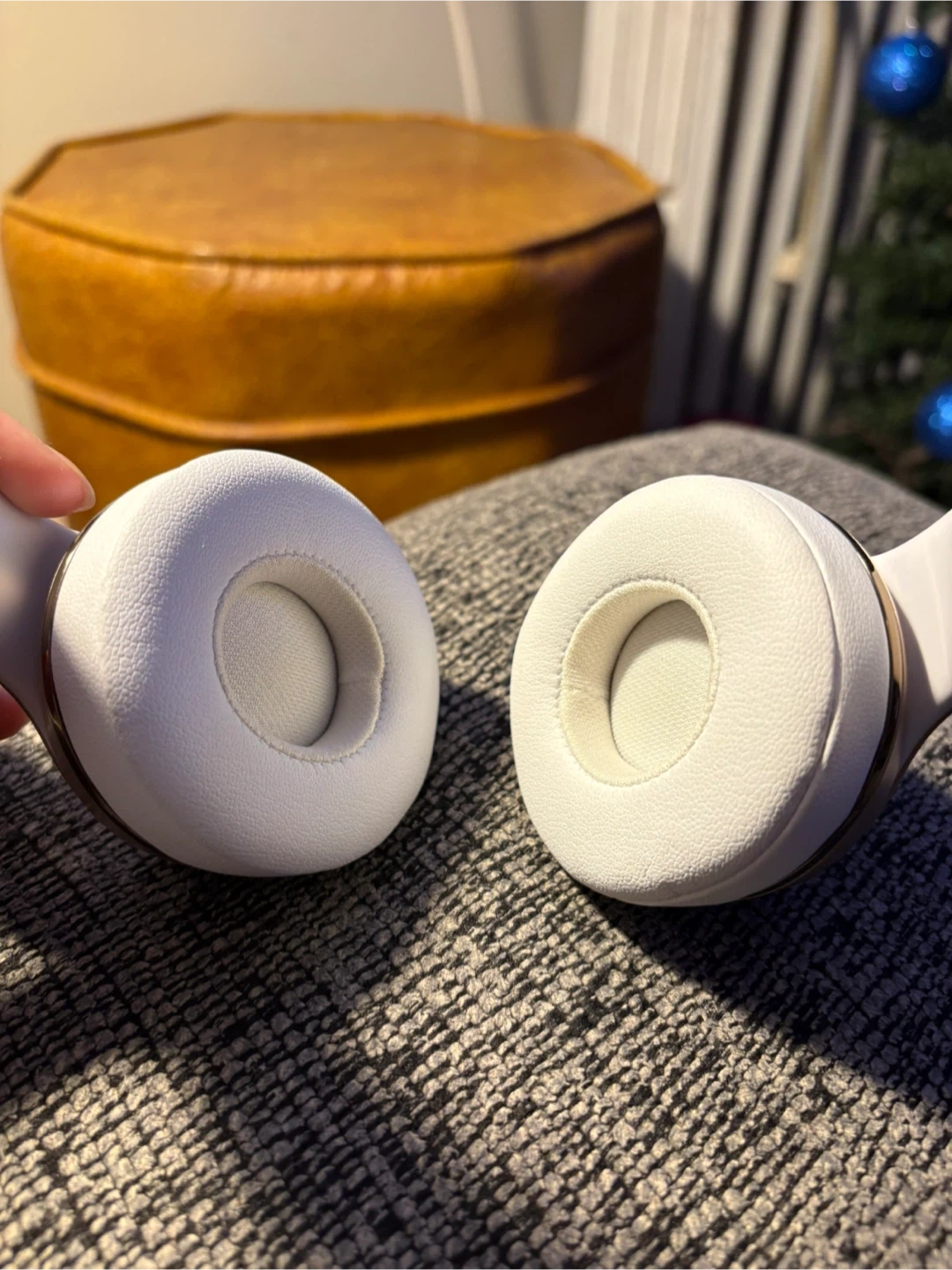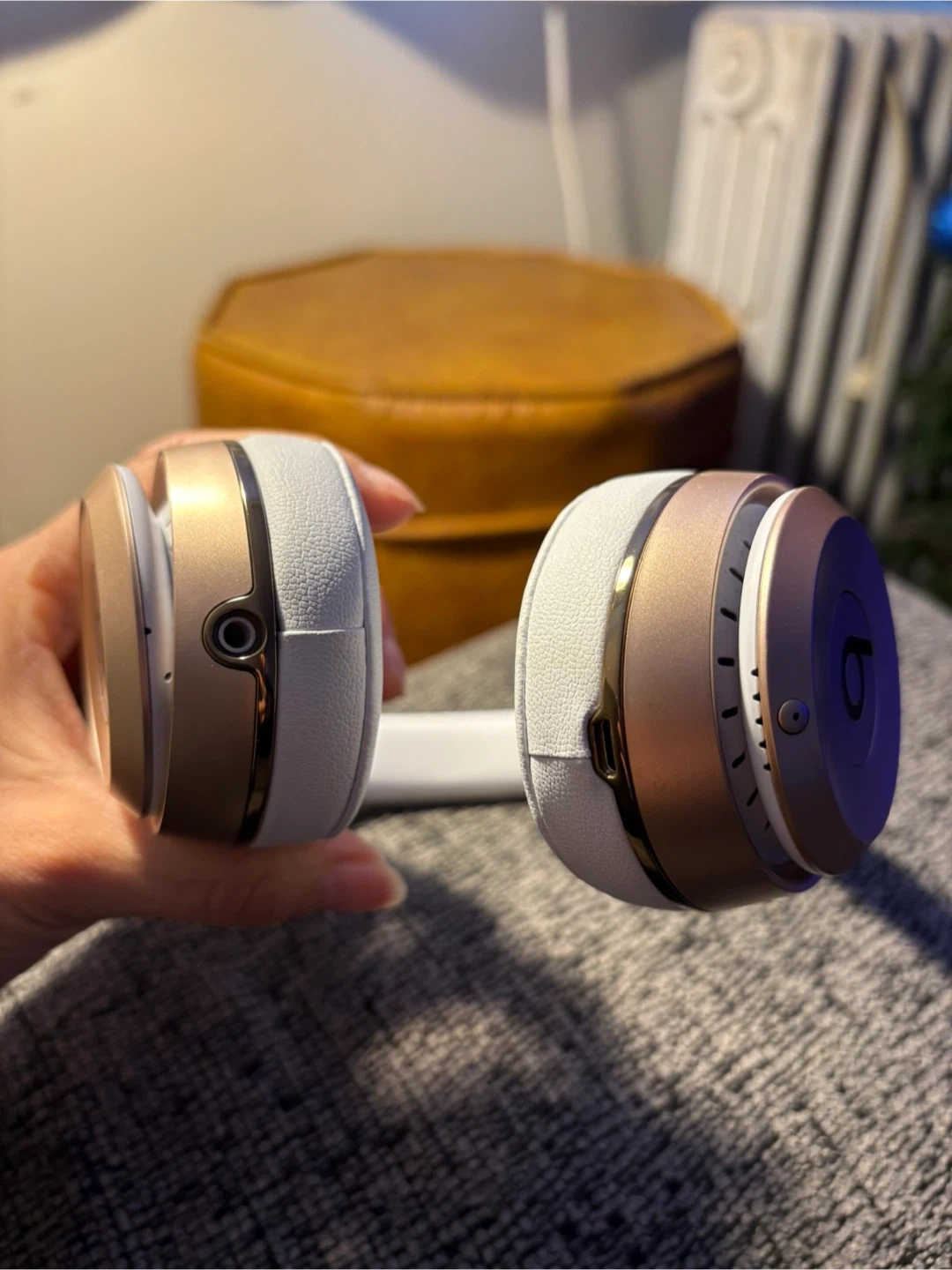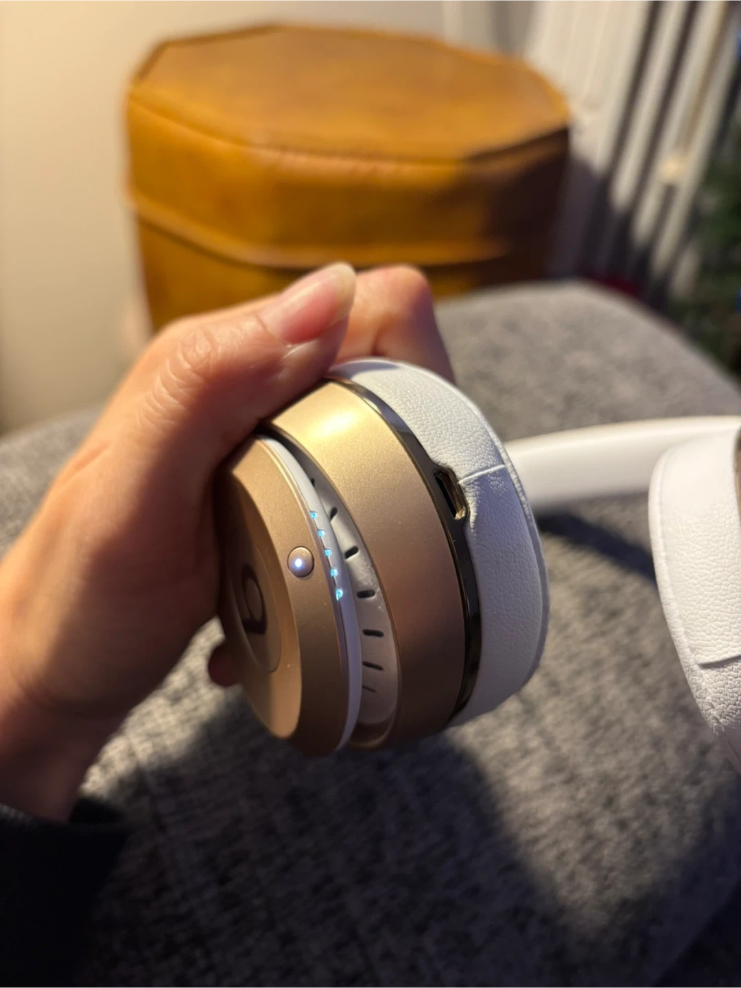 Selling a pair of Beats Solo 3 wireless headphones in gold and white. They're in great shape and ready for a new owner!
