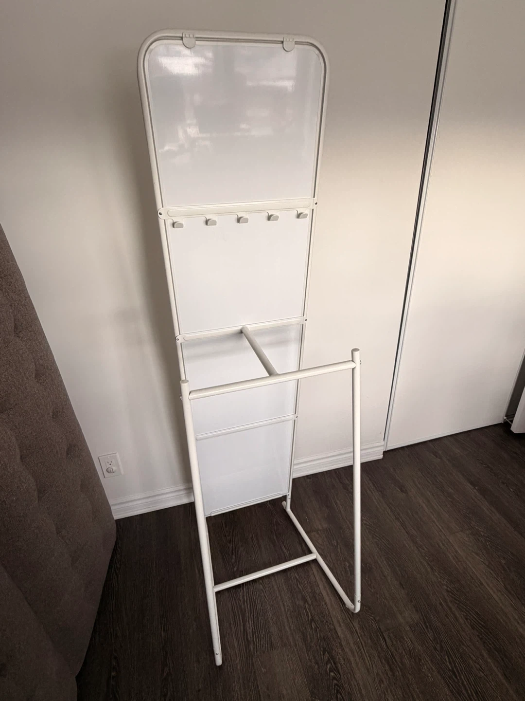 Modern white frame, compact footprint, and easy to move. Works well in bedrooms, closets, or condos.