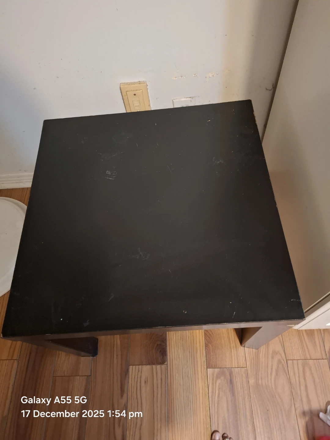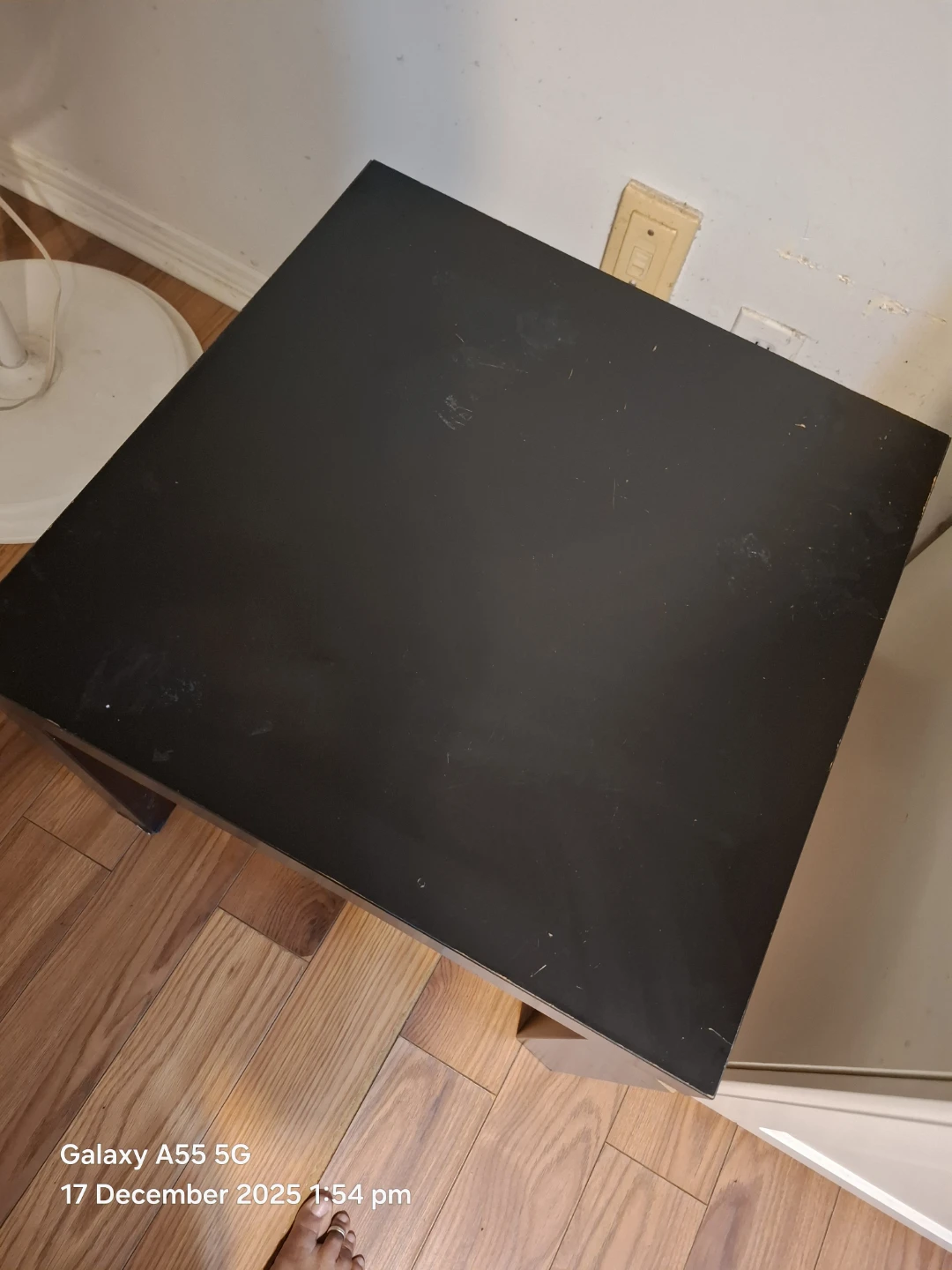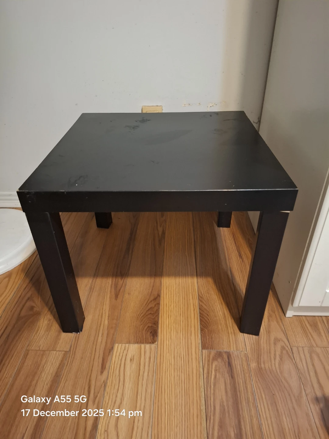 Selling a black side table. It has a square top and sturdy legs. It's perfect for a small space or as an accent piece in your living room or bedroom. It has some minor wear and tear, but is still in good condition!