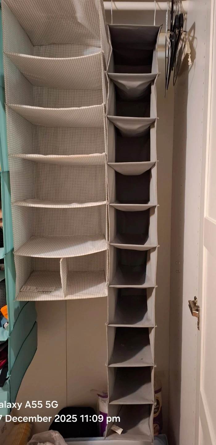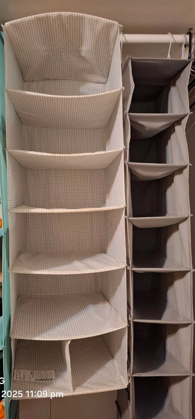 I'm selling two IKEA STUK hanging organizers! One is a light grey and white striped shelf organizer, and the other is a grey pocket organizer. They're both in great shape and ready to help you maximize your closet space