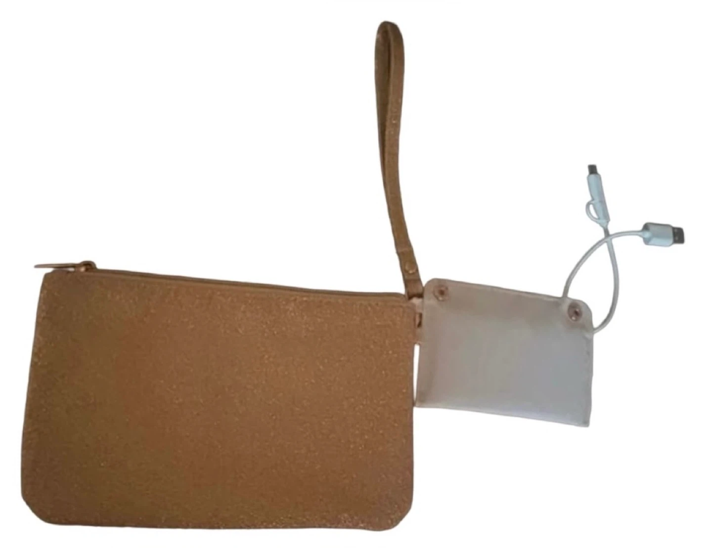 • 💫 Gold Glitter Wristlet with tech-ready charm and dual USB cables — sparkle meets utility