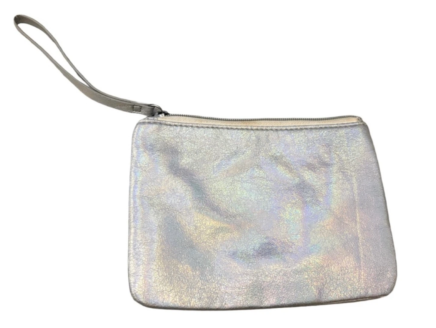 • 🌈 Iridescent Silver Wristlet with sleek strap and zipper closure — minimalist and modern