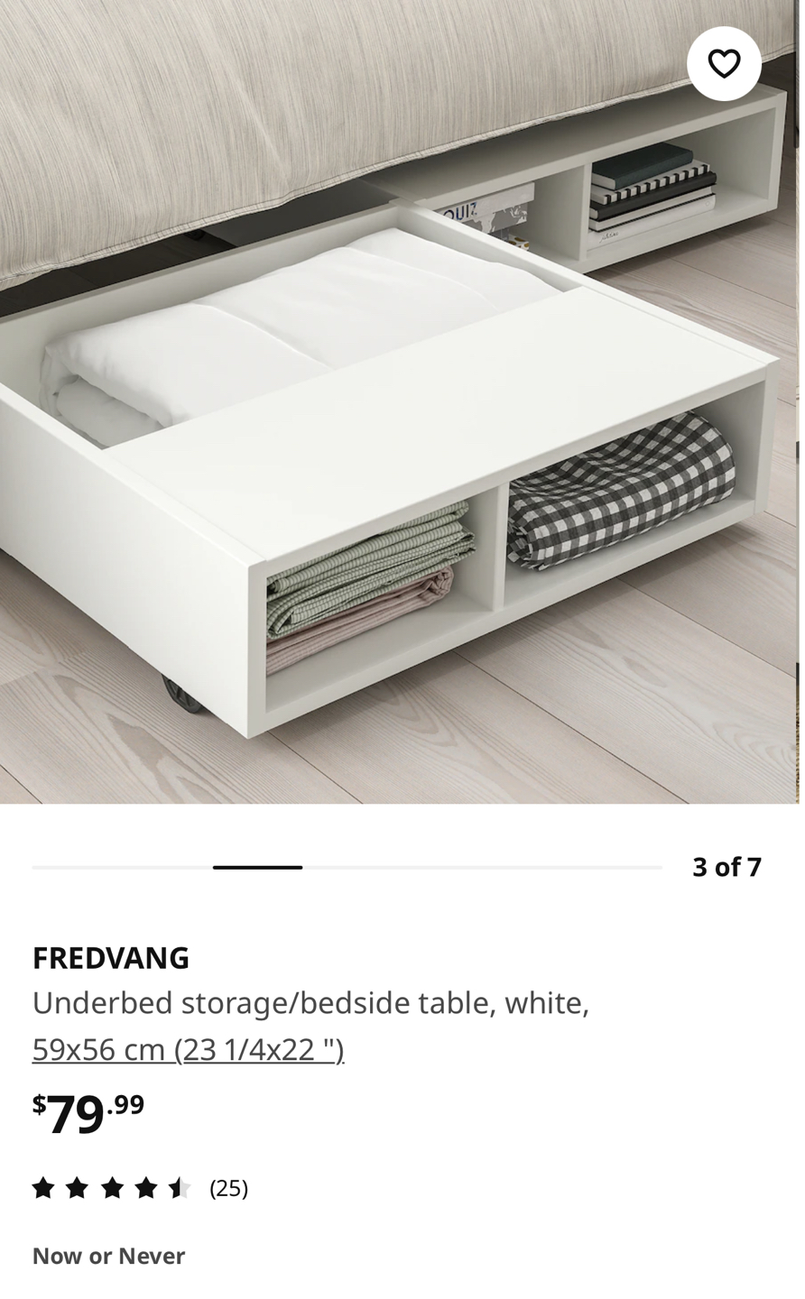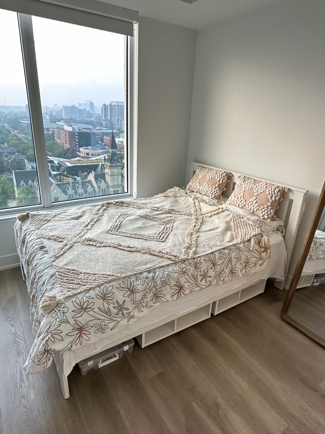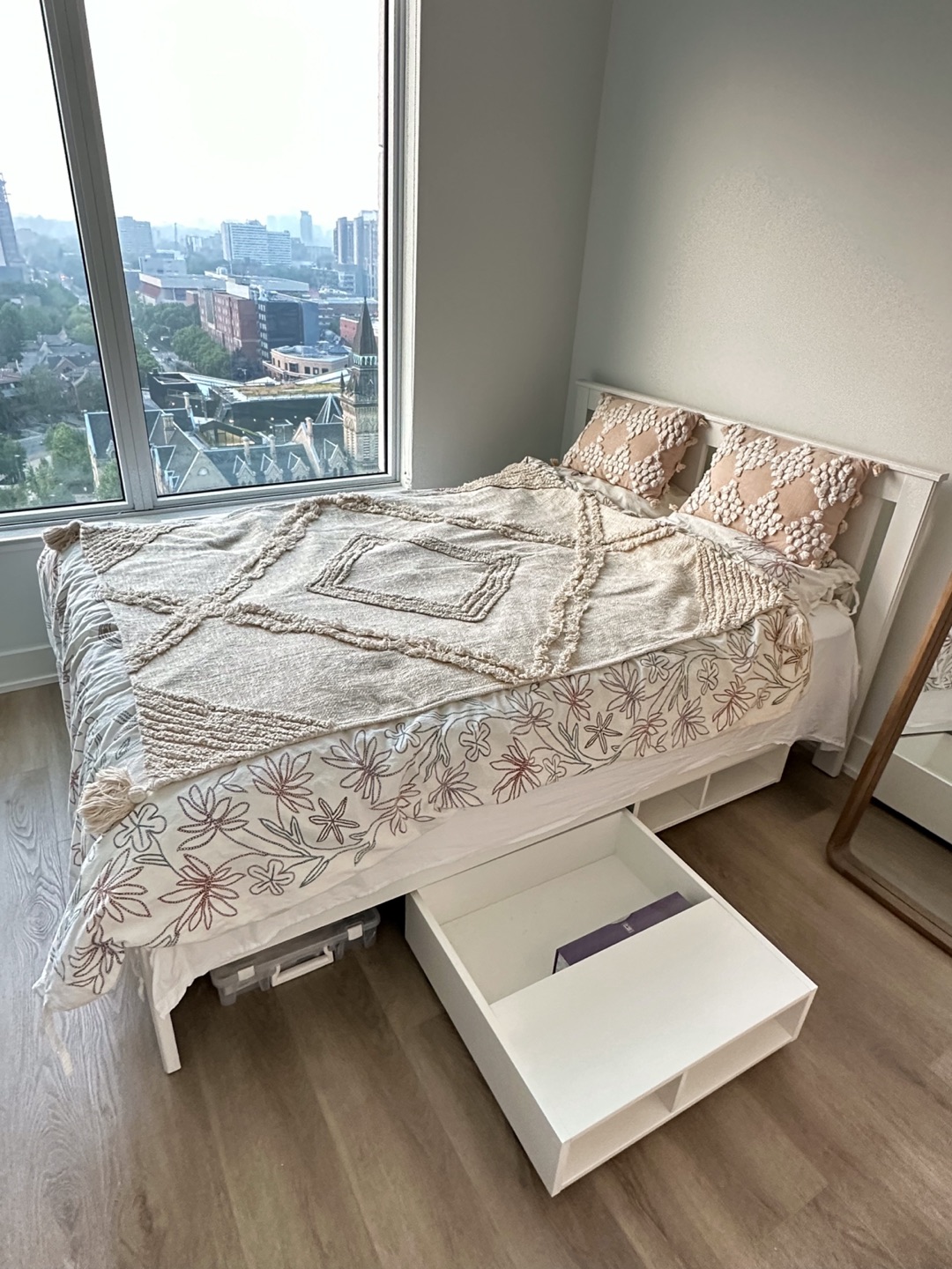 706Songesand white double bed frame with slatted bed base in like new condition. Includes 2 Fredvang underbed storage/bedside tables that can be rolled away. Mattress and bedding not included. (Can provide brand new duvet cover and pillow covers at an additional cost!) No scratches or dents, and will require disassembling for moving. Please check photos for dimensions! Item details: - Songesand: https://www.ikea.com/ca/en/p/songesand-bed-frame-white-luroey-s19241306/ - Fredvang: https://www.ikea.com/ca/en/p/fredvang-underbed-storage-bedside-table-white-10493638/ ❗️PICK-UP ONLY JULY 16 OR 17! (An earlier date during the week may be possible) Please let me know in advance a date and time you can pick up the furniture so I can book the elevator and parking spot! I will have other furniture listings and can provide a better offer if you purchase multiple items! :)