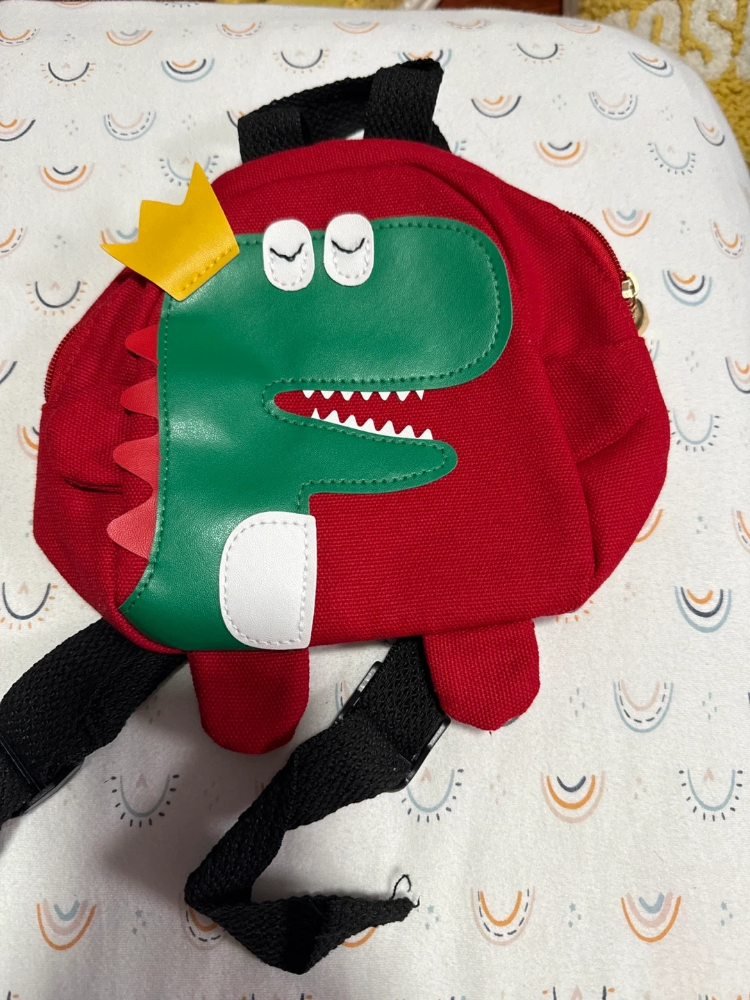 This adorable red backpack features a fun dinosaur design! It's perfect for toddlers or young children. The backpack has adjustable straps for a comfortable fit.