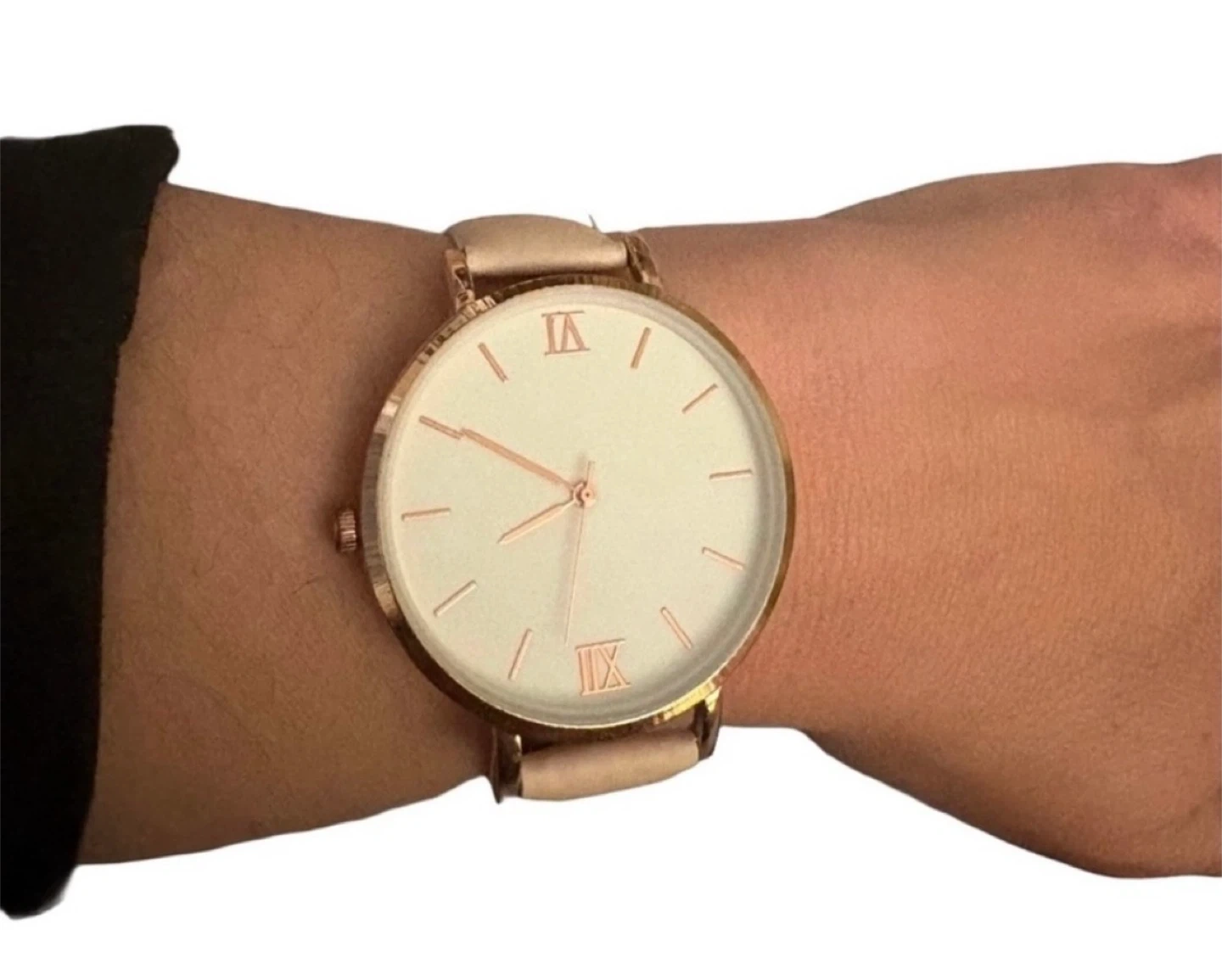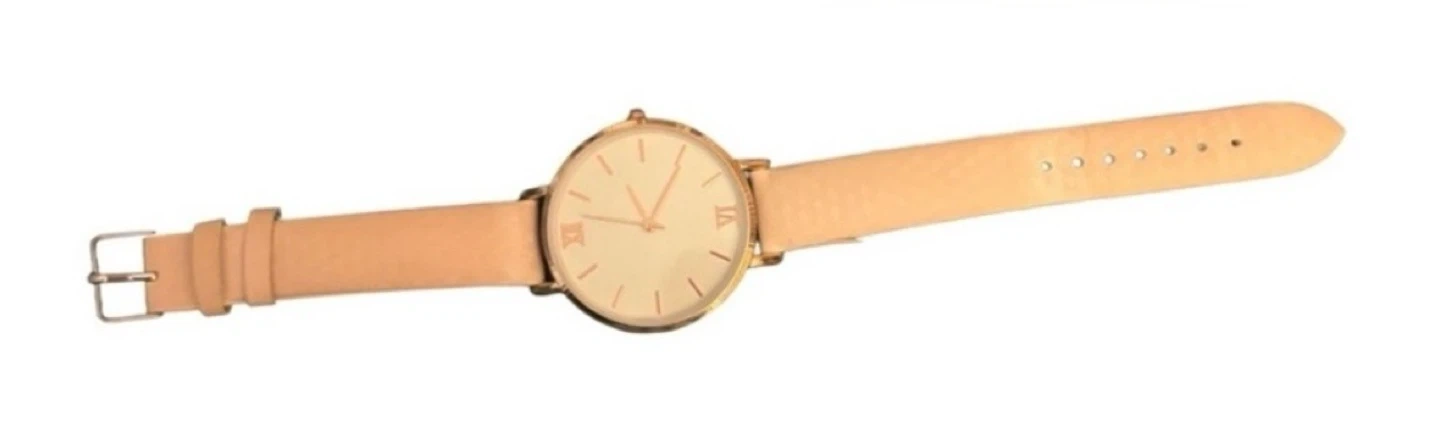 🌸 White‑to‑Pink Round Watch: Minimalist design with a faux leather strap and gold Roman numerals. The dial shifts from crisp white to soft pink depending on temperature, creating a unique, personalized look every time you wear it. Note: battery currently not working.