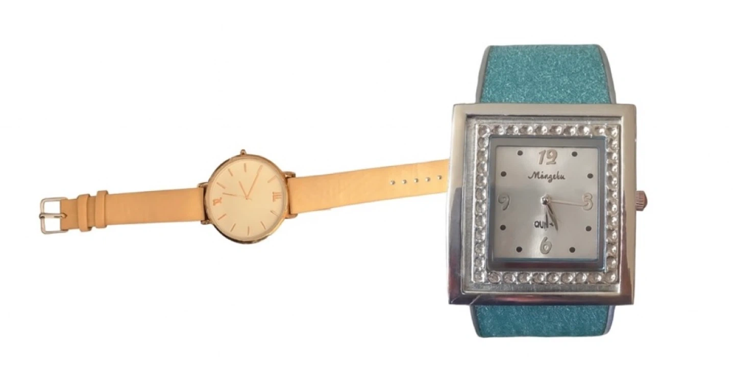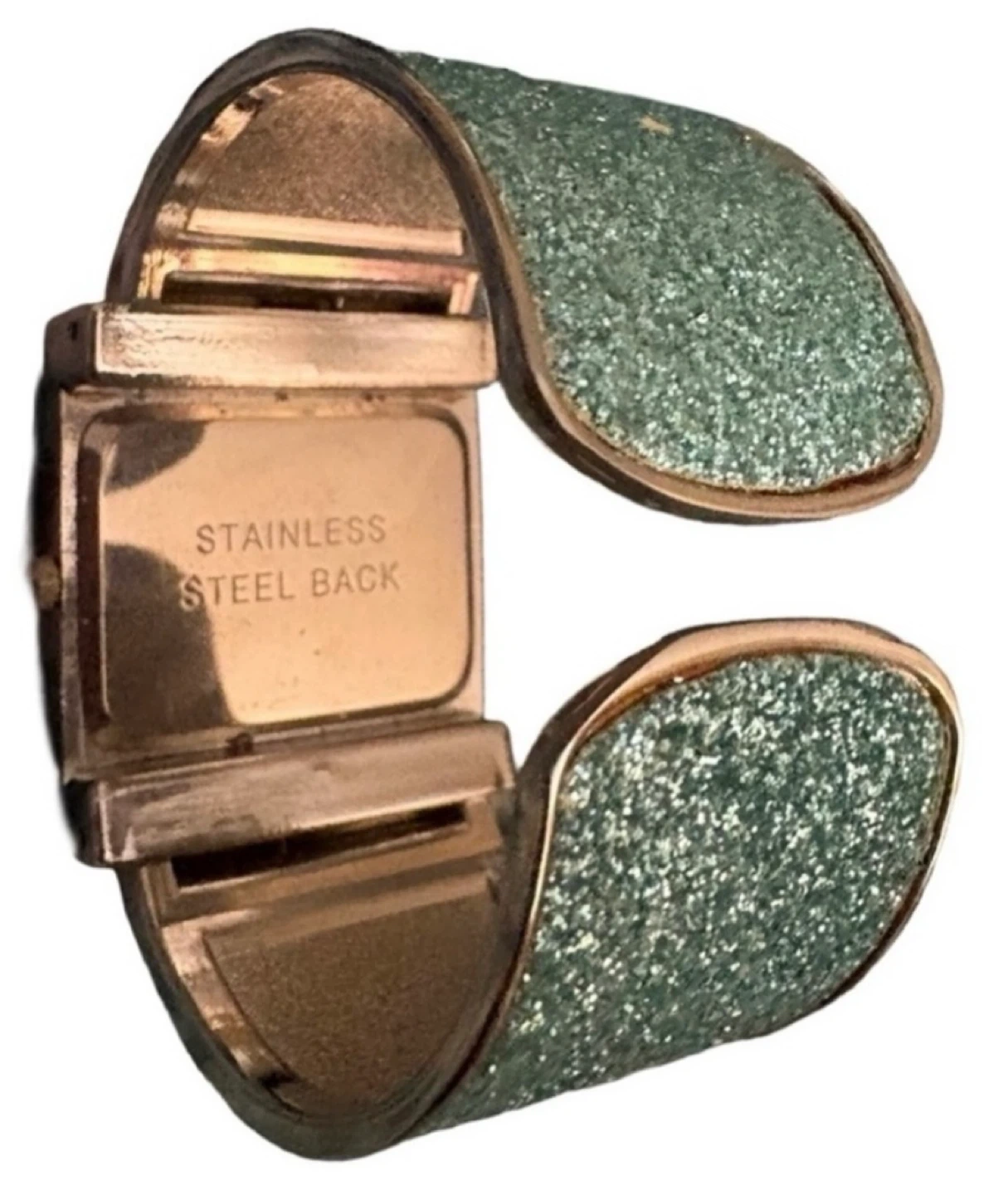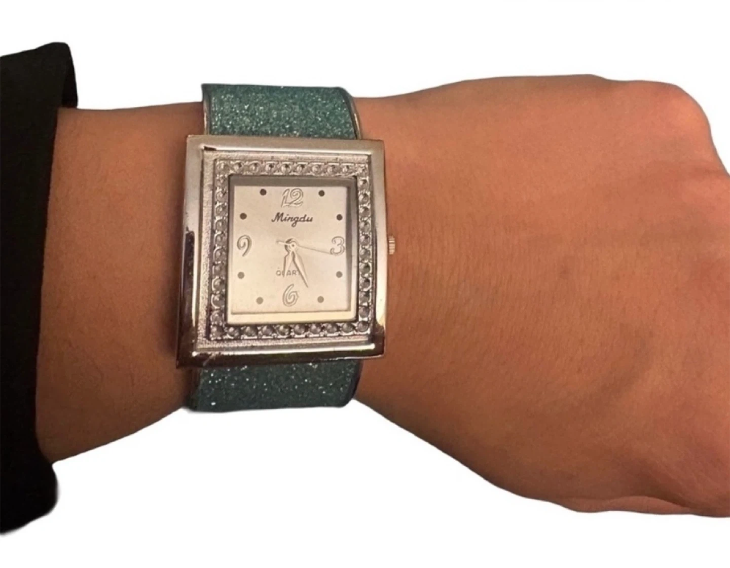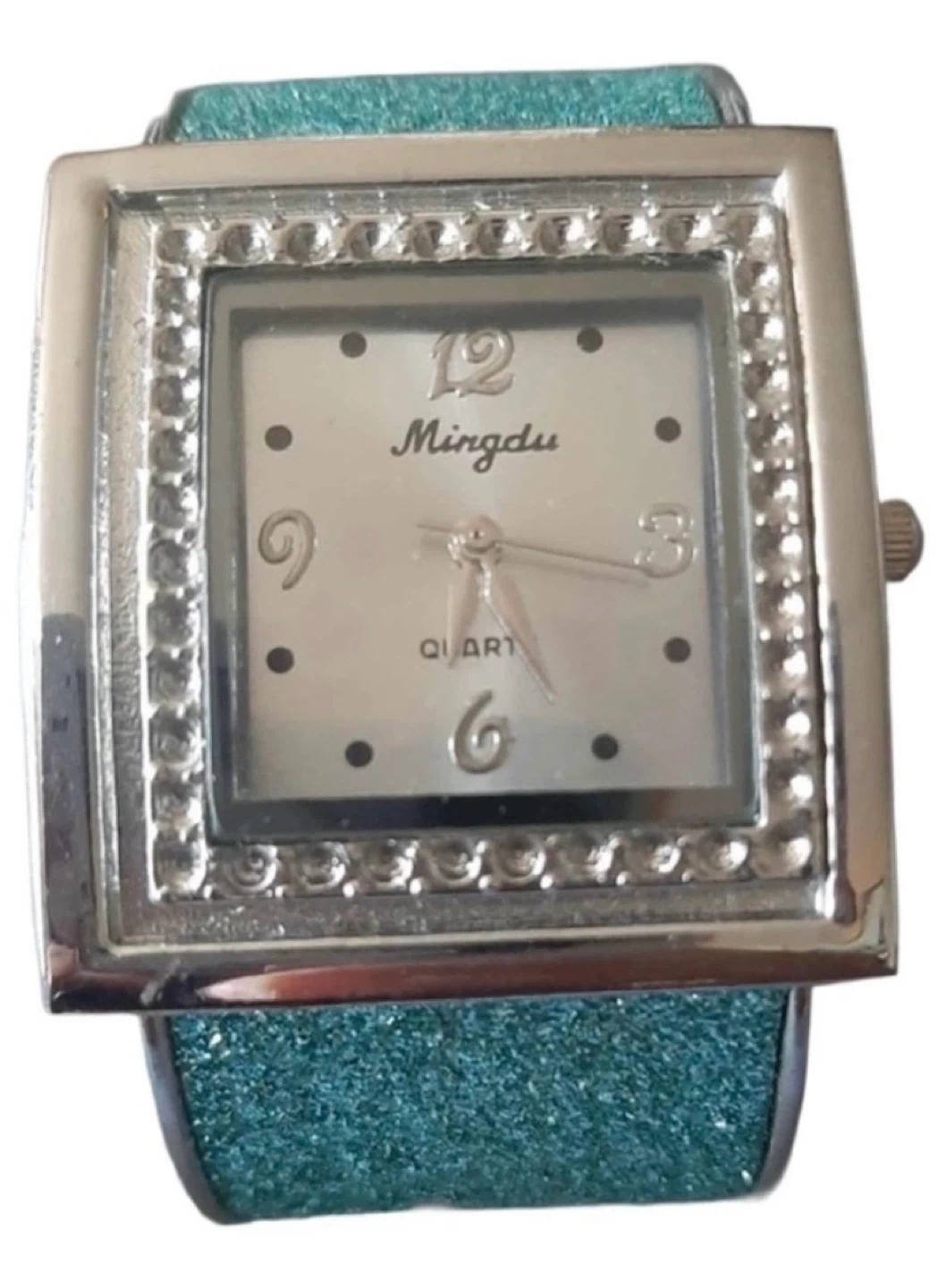 ✨ Teal Square Watch: Glittery strap with rhinestone bezel and vintage Mingdu dial. A bold, sparkling staple that stays true to its teal charm. Note: battery currently not working.