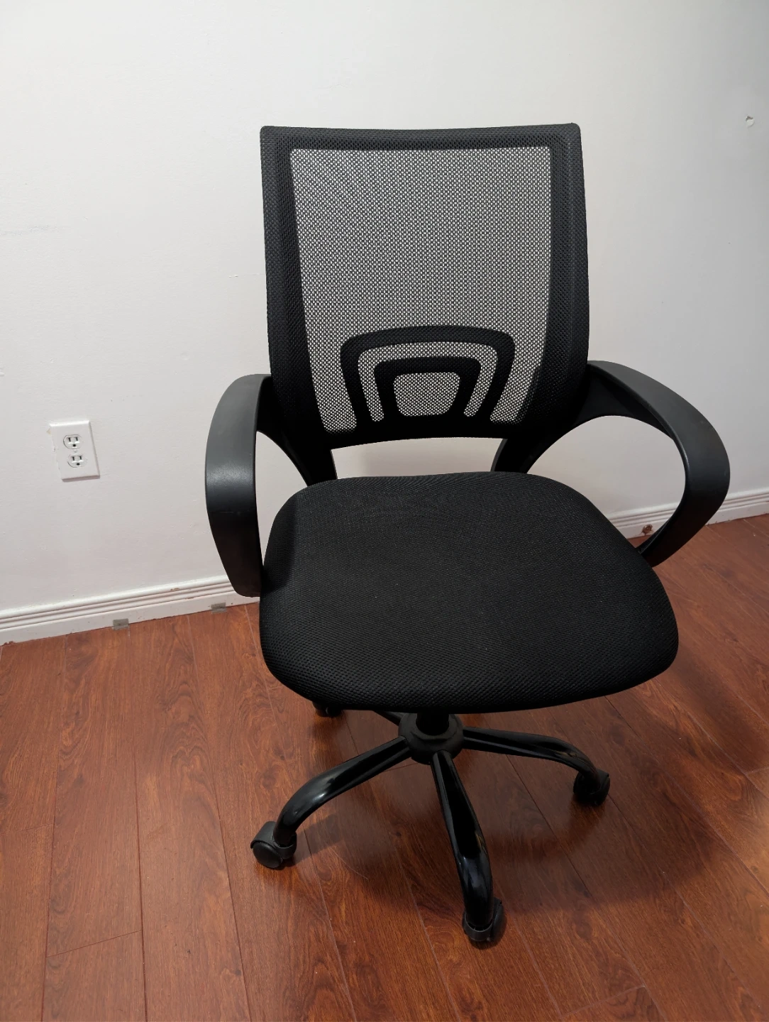 Looking to sell this office chair! It's in great condition and has a comfortable mesh back. The chair is black and features a padded seat and armrests. It's perfect for your home office or study space!