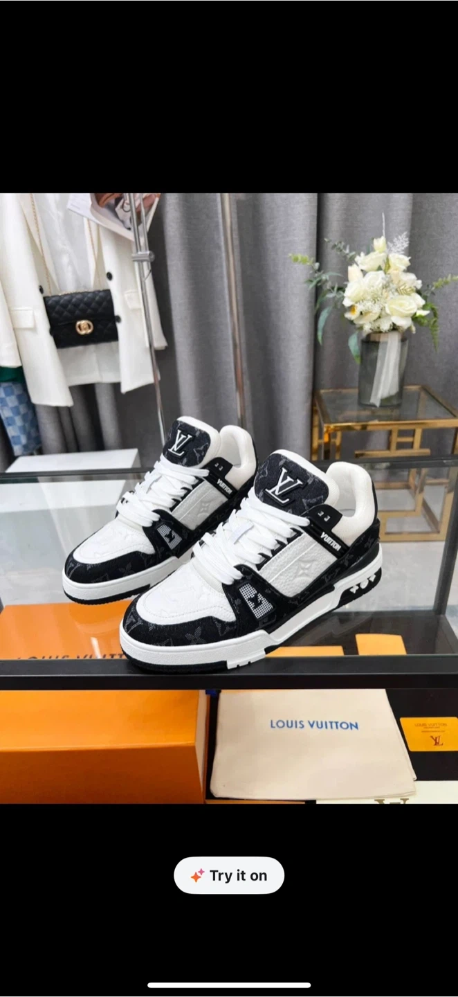 Selling a pair of Louis Vuitton sneakers in black and white. They are in great condition and come with the box. These stylish sneakers are perfect for adding a touch of luxury to your everyday look!