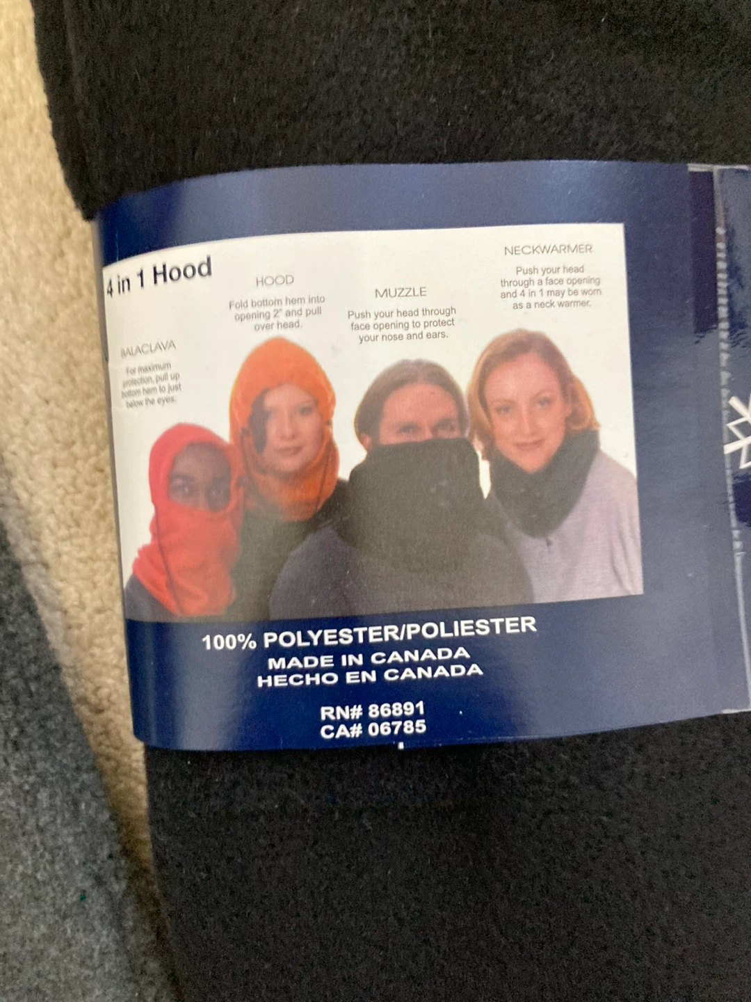 Selling a TST 4 in 1 hood! It's black and made of 100% polyester. It can be used as a balaclava, hood, muzzle, or neck warmer. Made in Canada!