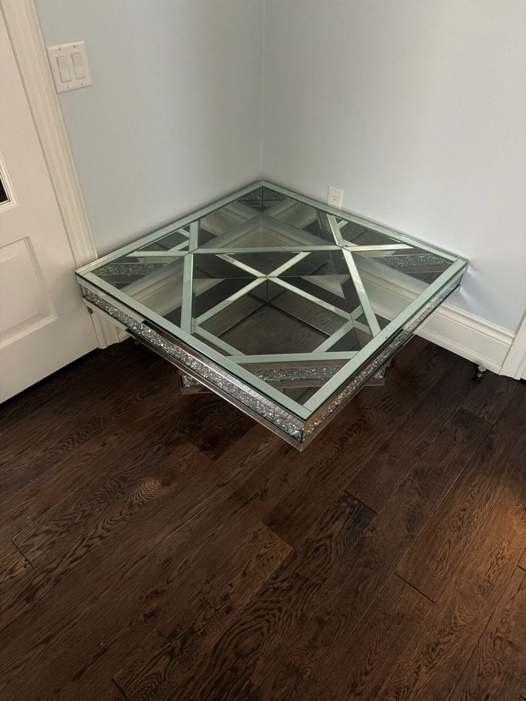 Selling a coffee accent table. It features a mirrored top with a geometric design and crystal-like trim. It's in great condition and would add a touch of glam to any room!
