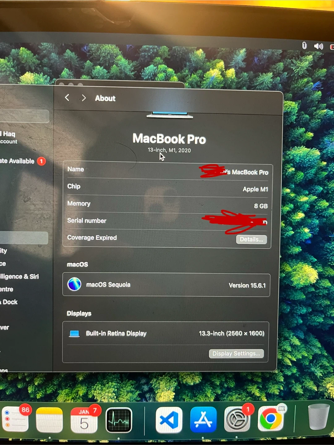Selling a MacBook Pro 13-inch with the M1 chip from 2020. It has 8 GB of memory and a built-in Retina display. Runs macOS Sequoia version 15.6.1