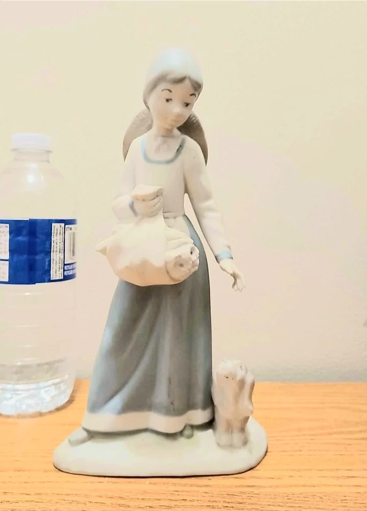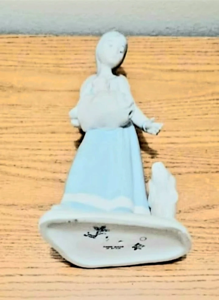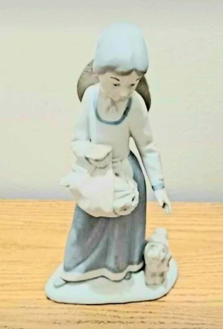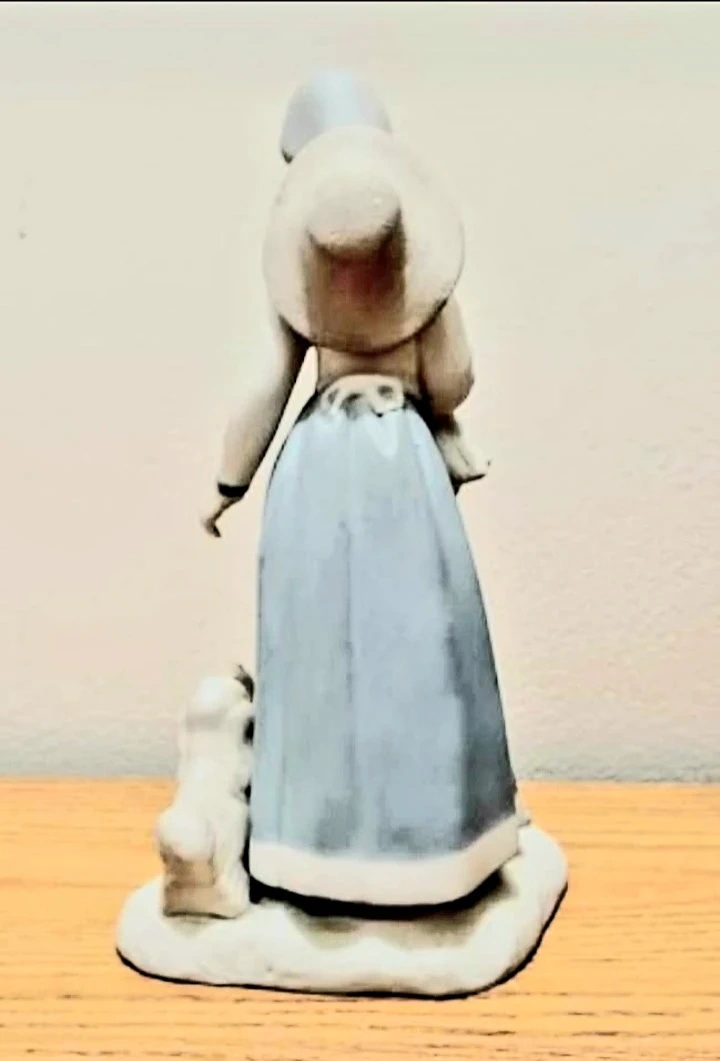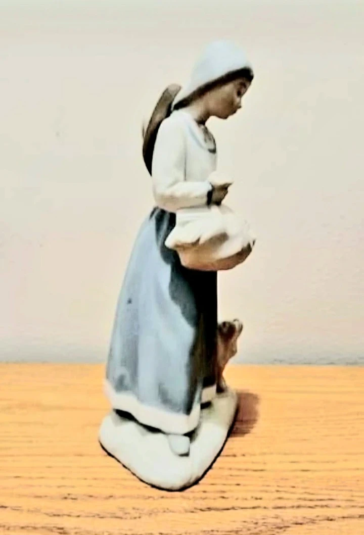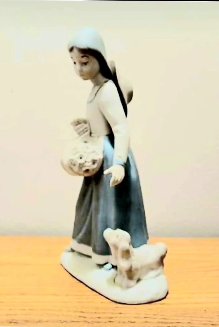 This Vintage Rex Valencia Porcelain Statue is Hand-painted and showcases a charming pastoral scene, capturing a young girl with her dog and a basket. In Very good condition, his delicate piece adds a touch of classic elegance to any collection.
