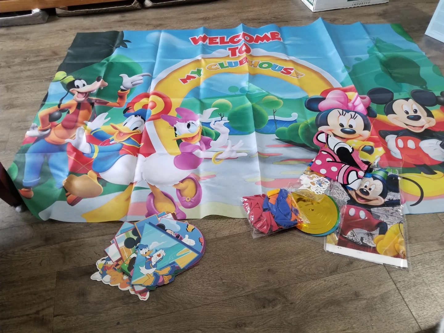 I'm selling a set of Mickey Mouse Clubhouse party decorations. It includes a large banner, balloons, Foil balloons, happy birthday Banner, tablecloth, cupcake toppers and Swirl Fabric Banner approximately 58x39