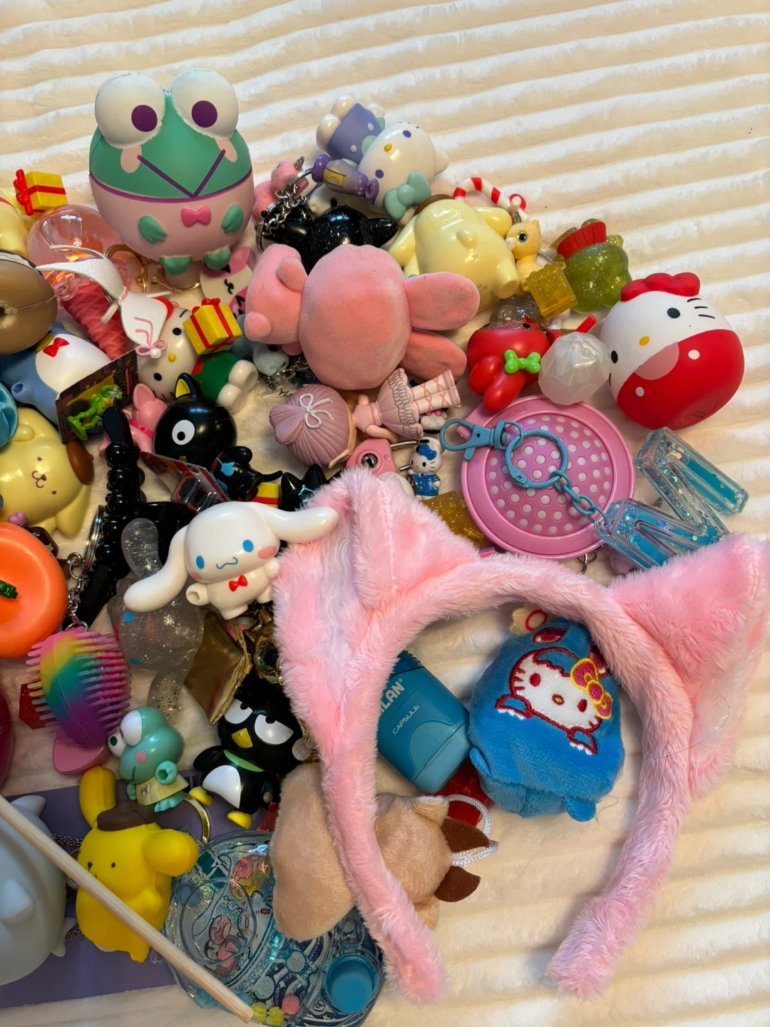 A mixed lot of various toys and accessories, including Hello Kitty figured, plush hair accessories, a heart-shaped decoration, and other small items. Perfect for kids or collectors!