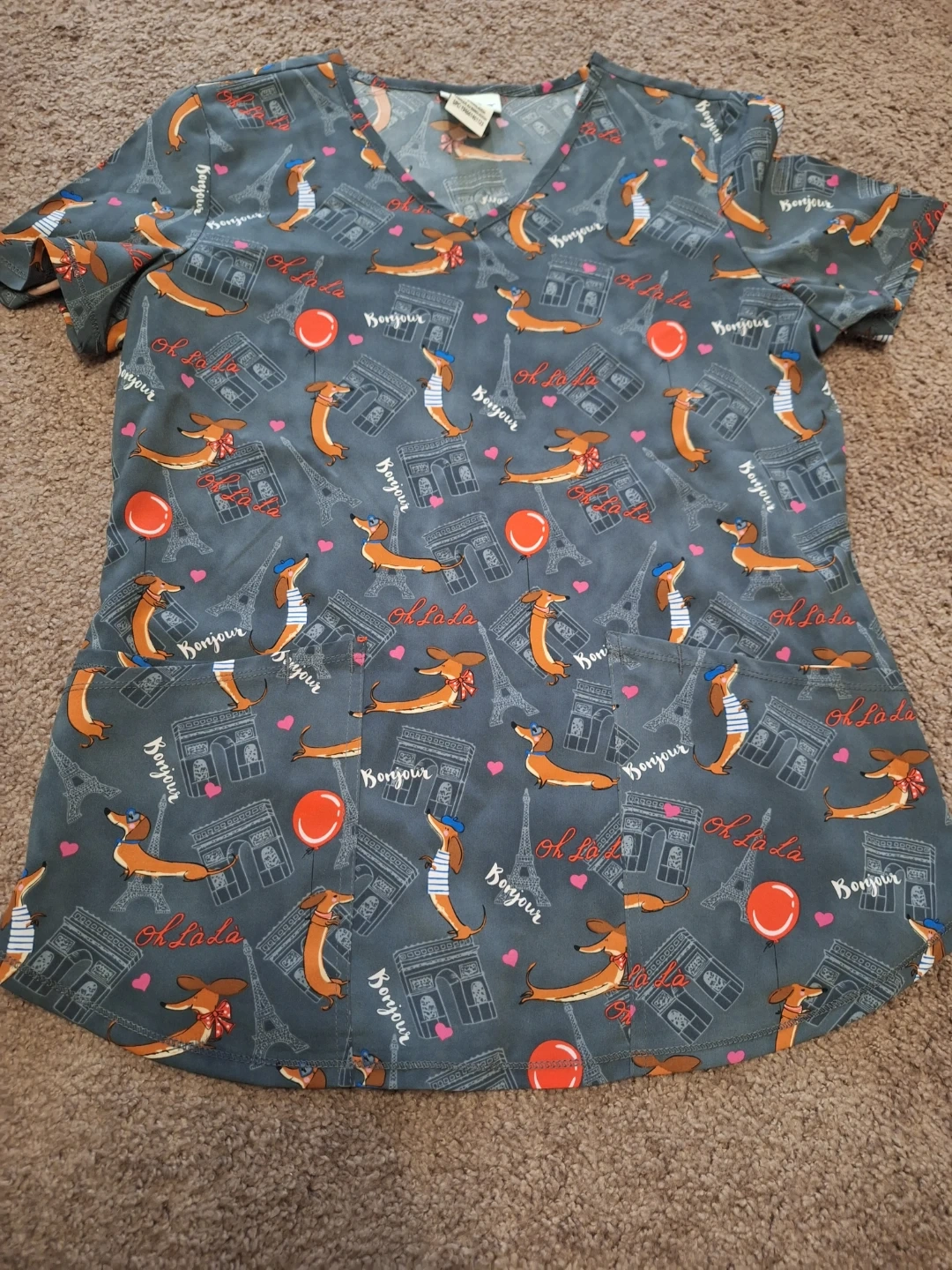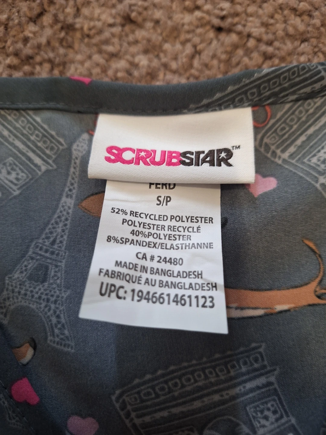 Selling a cute Scrubstar scrub top in size S/P (Small/Petite)! It features a fun Paris-themed print with dachshunds, Eiffel Towers, and Arc de Triomphes. The material is 52% recycled polyester, 40% polyester, and 8% spandex/elastane, making it comfy for all-day wear. Pickup only.
