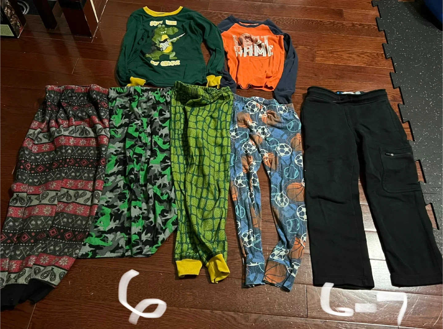 Gifting assorted kids' clothing in sizes 5 to 8. There's a variety of items including pyjama pants, t-shirts, dresses, and hoodies. Please note the condition of the clothes