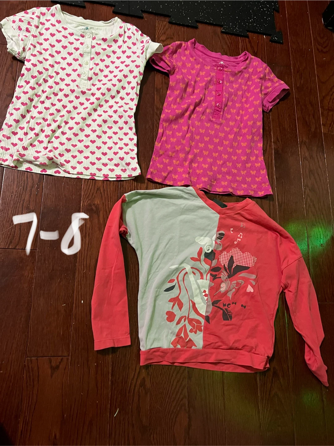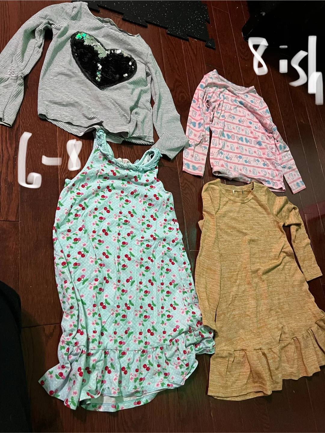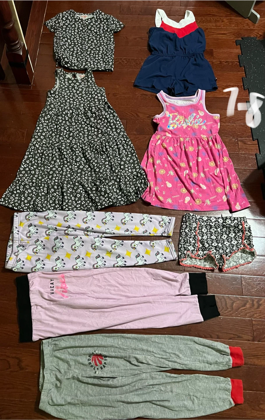 Gifting assorted kids' clothing in sizes 5 to 8. There's a variety of items including pyjama pants, t-shirts, dresses, and hoodies. Please note the condition of the clothes