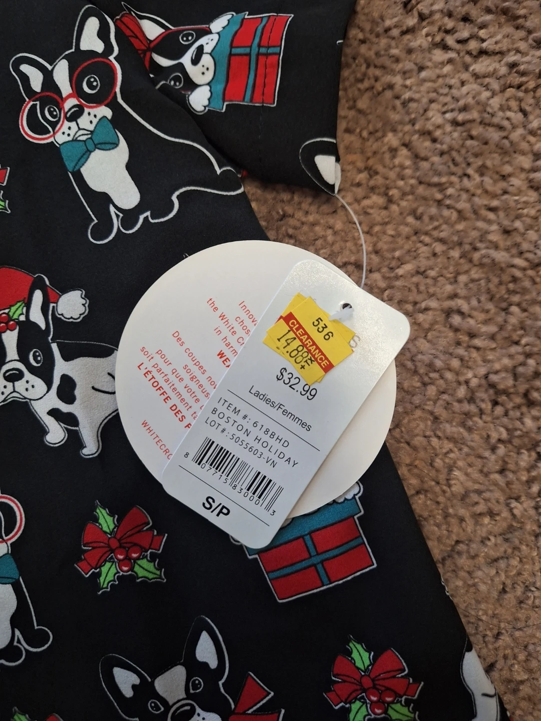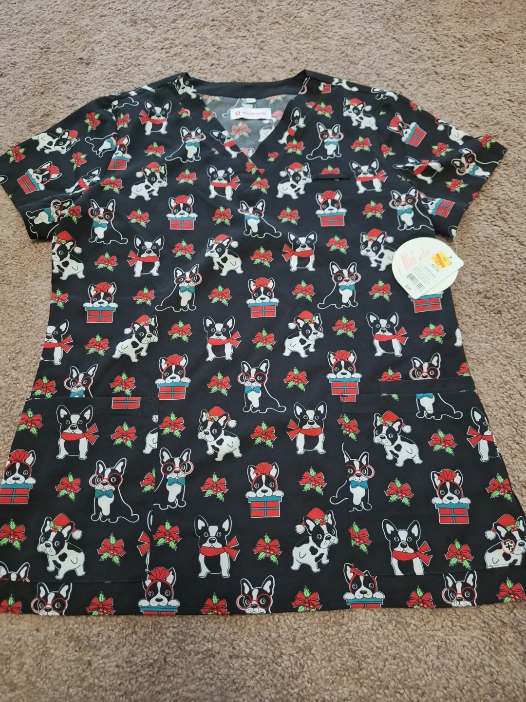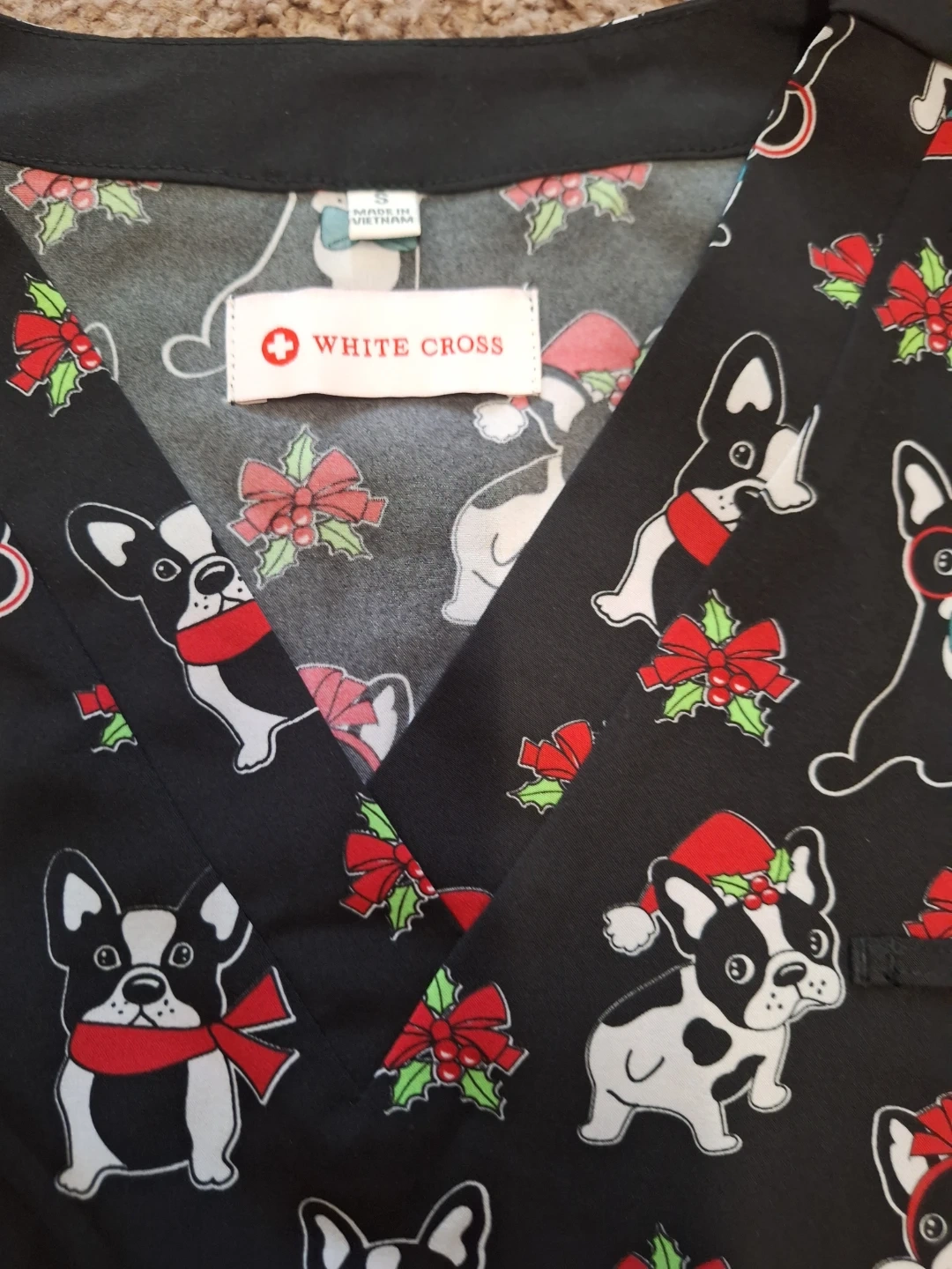 Pick up only.Selling a White Cross scrub top with a cute Boston Holiday print! The size is S/P (Small/Petite) to M. It features a fun pattern with Boston Terriers and holiday accents. Originally bought for $32.99.