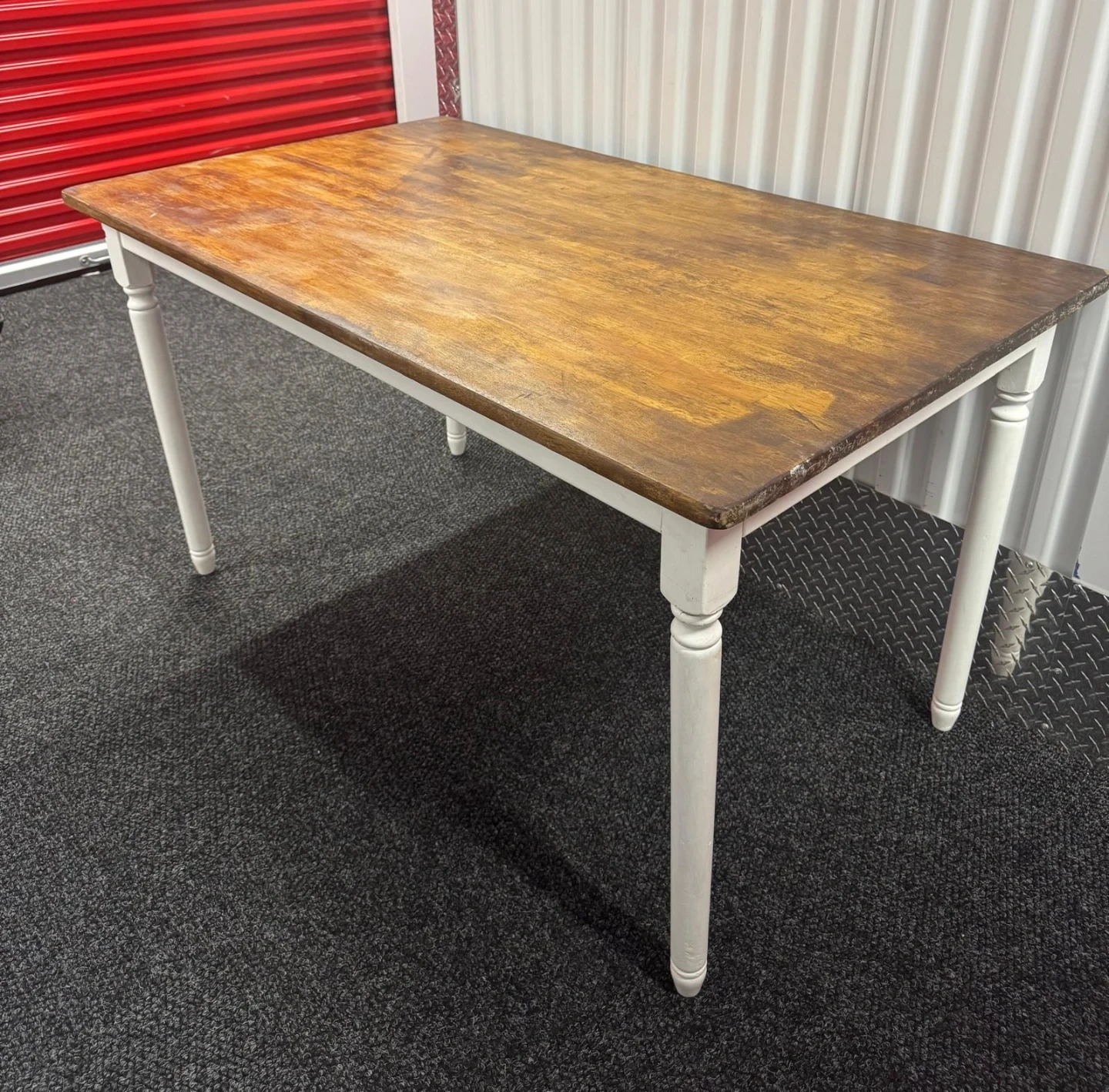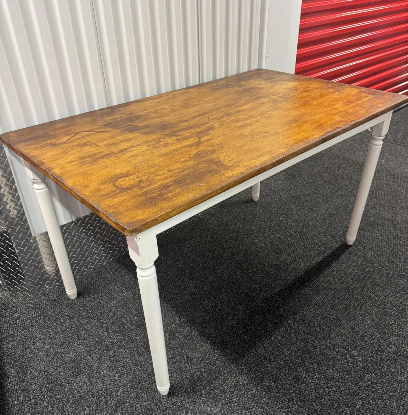 Selling a wooden dining table with a brown top and white legs. It's sturdy and perfect for a small dining area or kitchen.