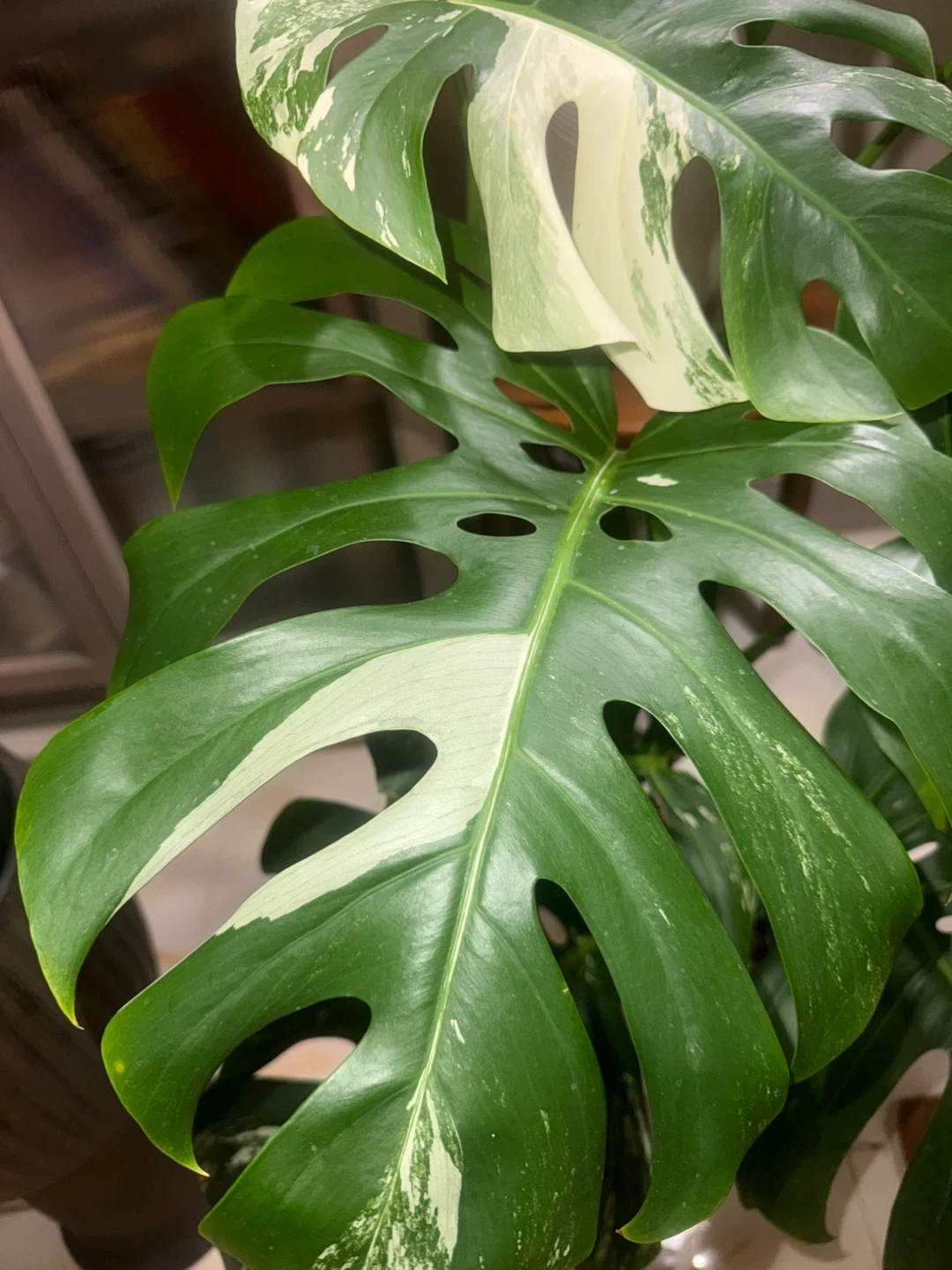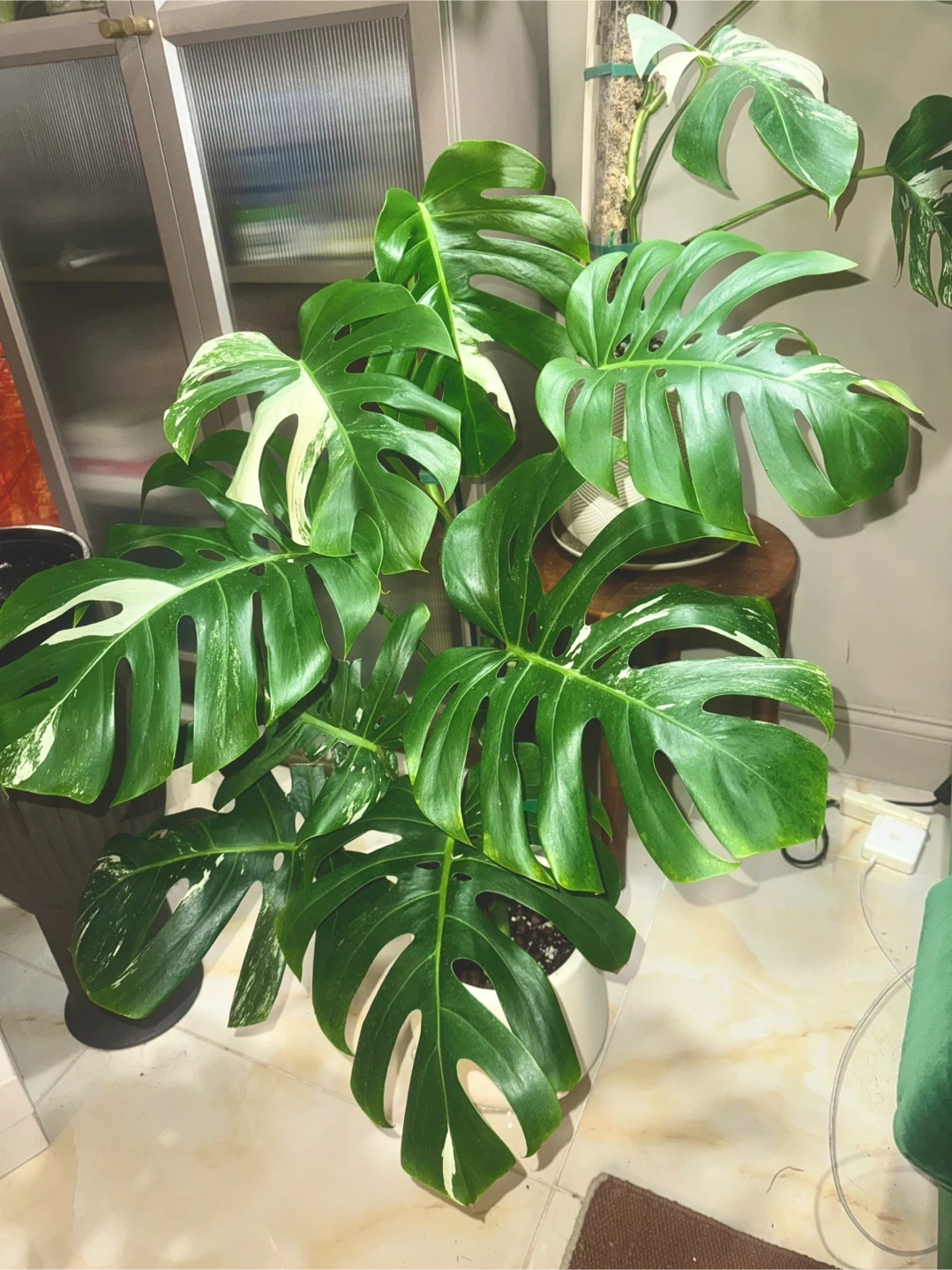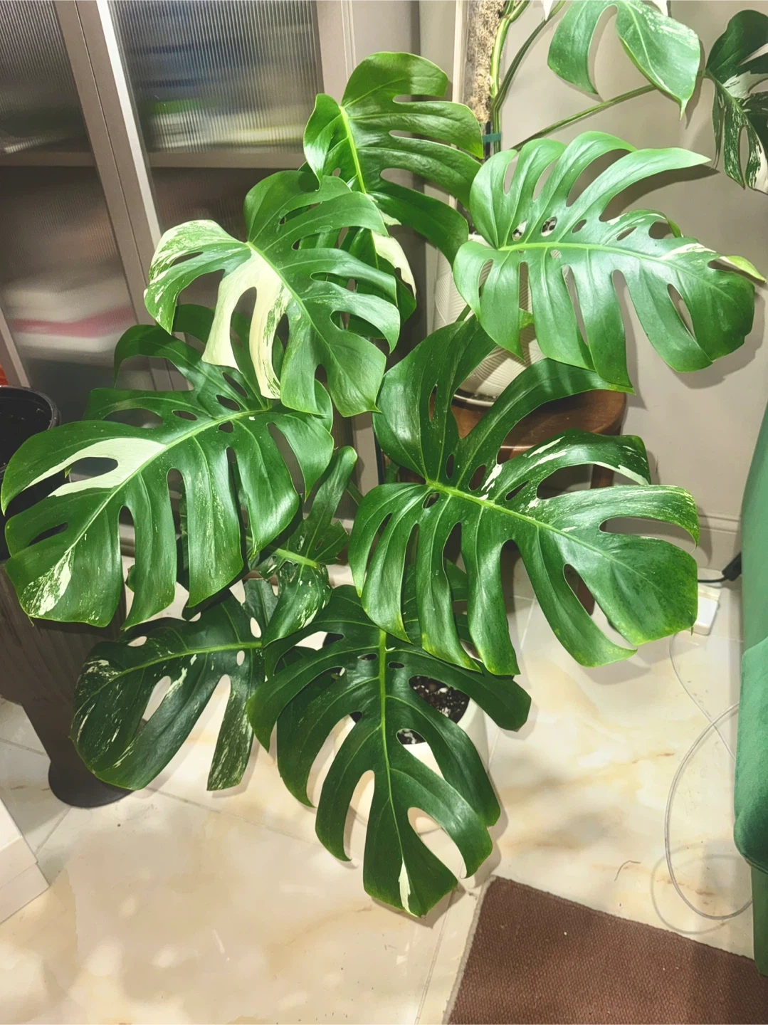 a beautiful Monstera Albo Variegata plant! It's a stunning addition to any indoor garden with its unique variegated leaves. This plant is healthy, large size and well-cared for, ready to bring a touch of the tropics to your home. 8” white planter included