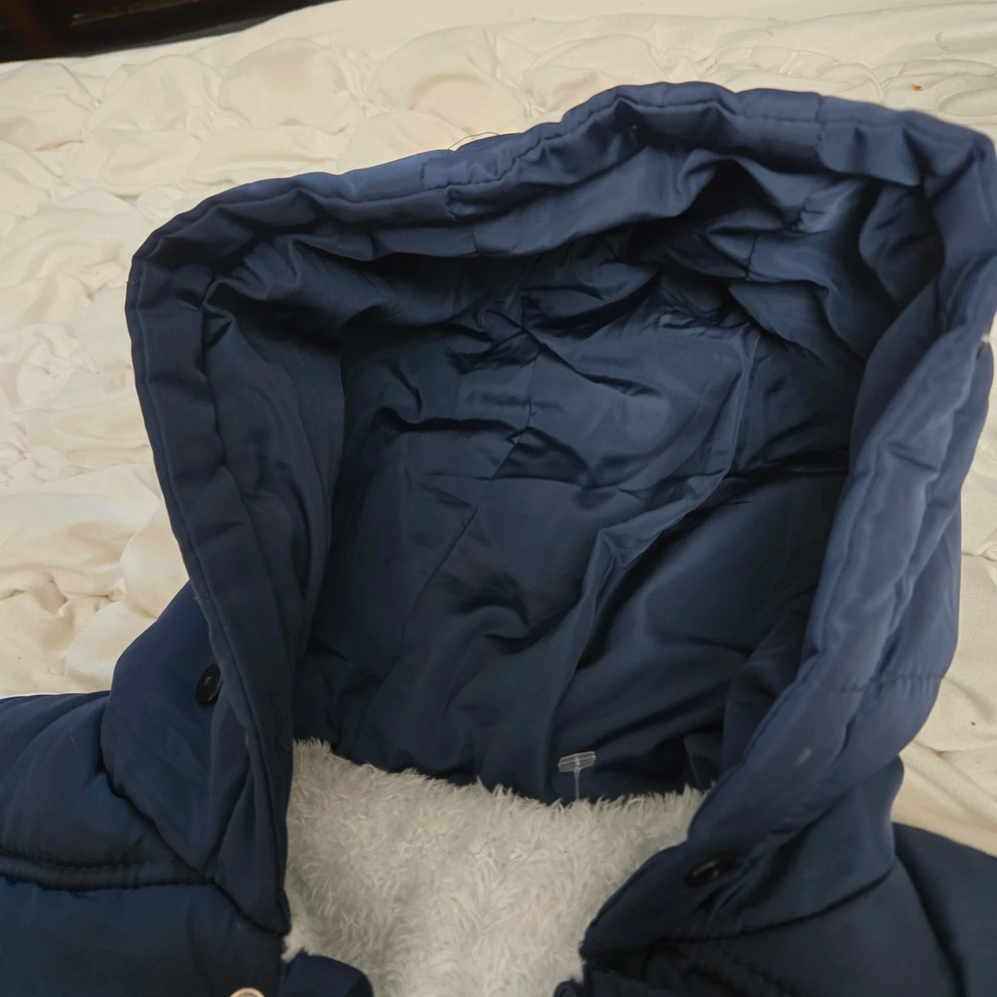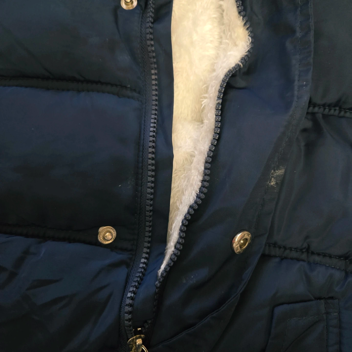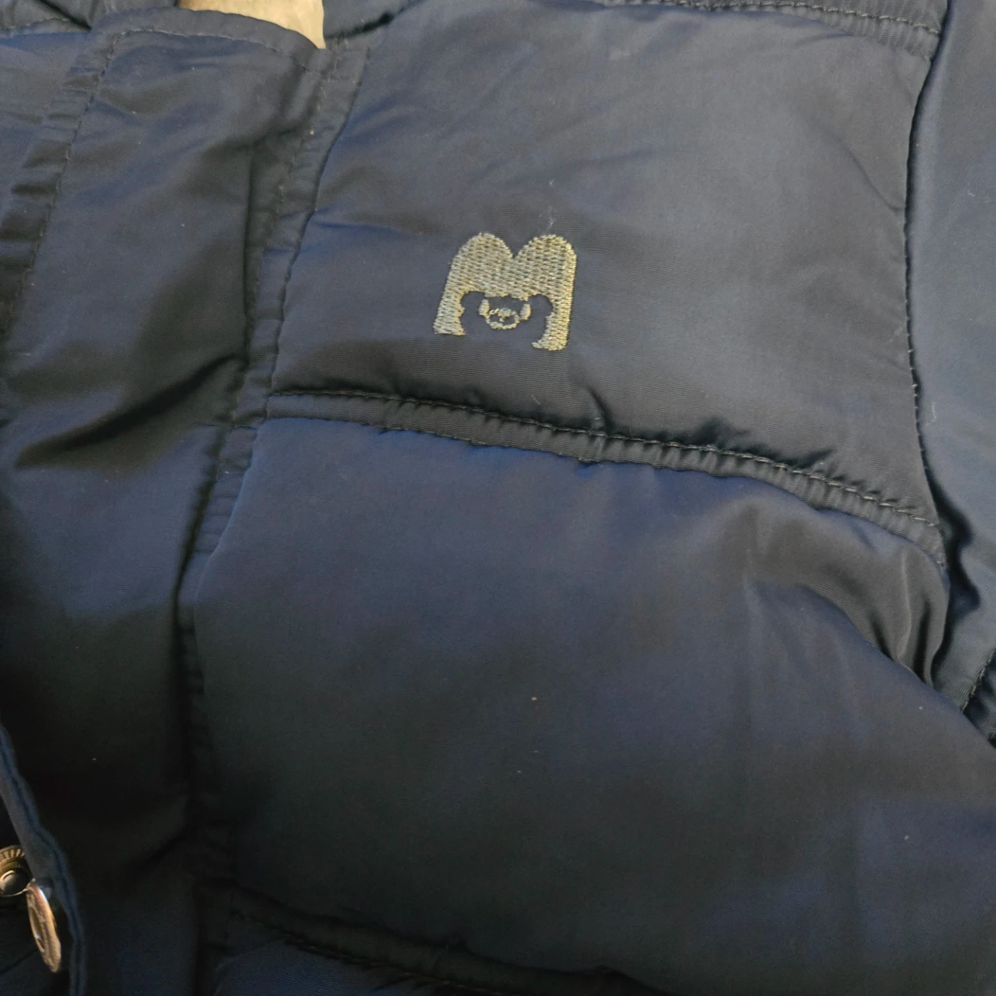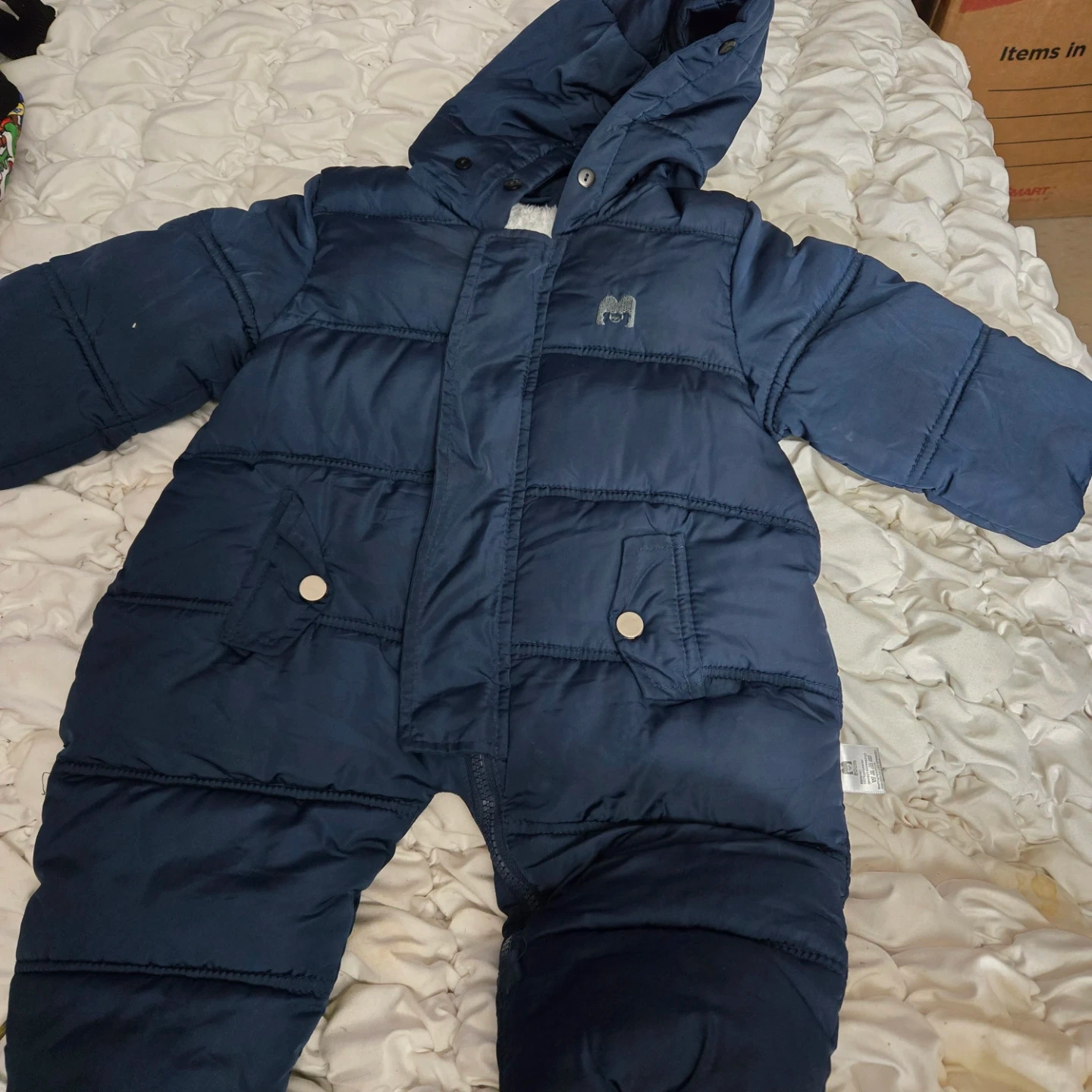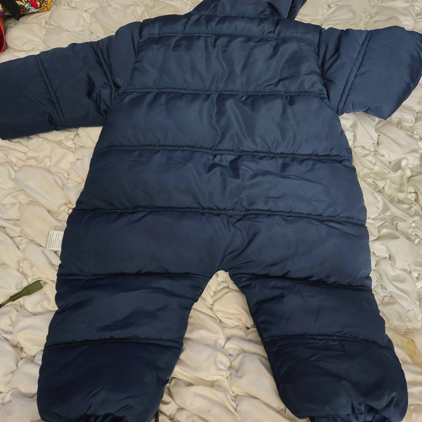 Here's a cozy blue padded snowsuit for your little one! It has a hood and zipper closure to keep them warm during the colder months. Perfect for outdoor adventures or just playing in the snow!