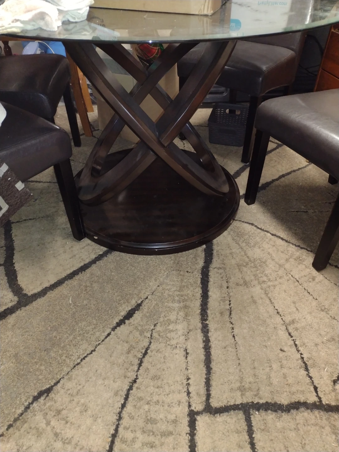 Selling a round glass top dining table, . The table features a unique, stylish base. Perfect for a smaller dining area or kitchen nook!